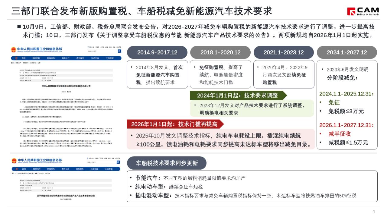10月9日,工信部、财政部、税务总局联合发布公告,对2026-2027年减免车辆购置税的新能源汽车技术要求进行了调整,进一步提高技术门槛;10日,三部门发布《关于调整享受车船税优惠的节能新能源汽车产品技术要求的公告》。两项新规均自2026年1月1日起实施。技术要求中,纯电动乘用车百公里电能消耗量要求调整为“不高于《电动汽车能量消耗量限值第1部分:乘用车》应对车型的电能消耗量限值”,同现行技术要求相比,达标准度总体提升13%-25%;其他技术指标则保持不变。
