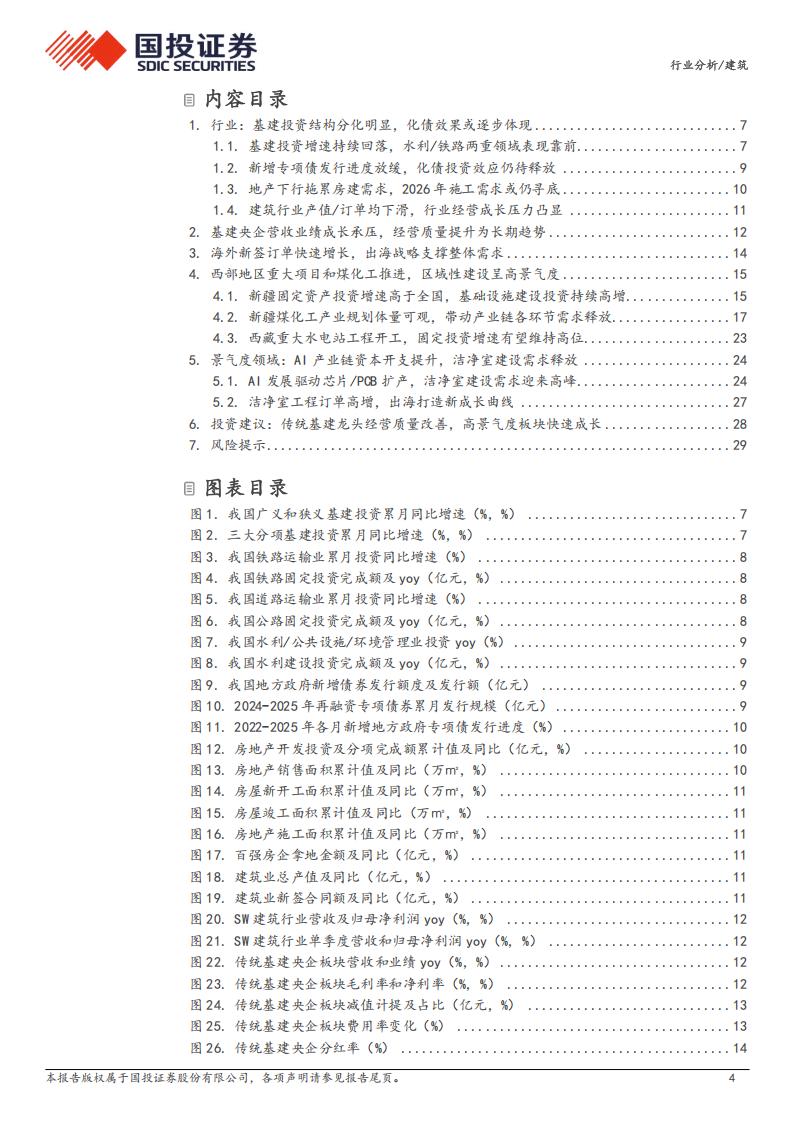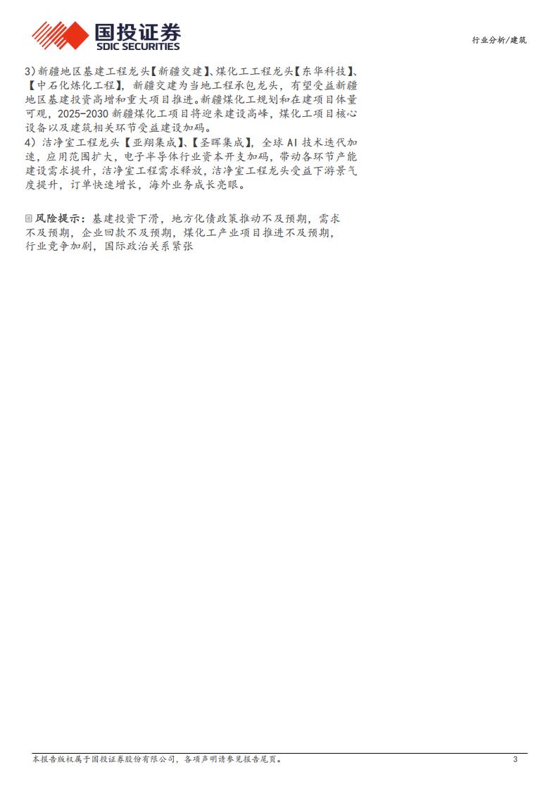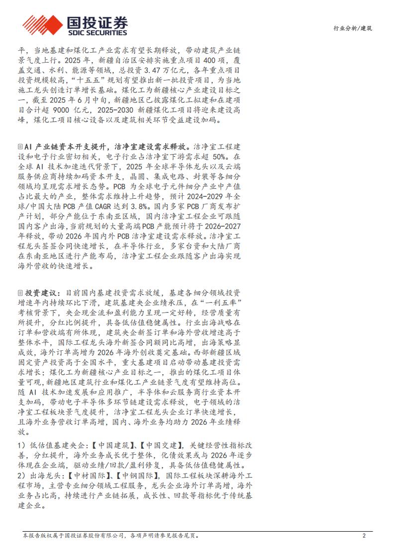 目投资建议:目前国内基建投资需求放缓,基建各细分领域投资增速年内持续环比下滑,建筑基建央企业绩承压,在“一利五率”考核背景下,央企现金流和盈利能力呈现一定好转,经营质量有所提升,分红比例提升,具备低估值稳健属性。行业出海战略在订单和营收端有所体现,建筑央企新签订单和海外营收增速高于整体水平,国际工程龙头海外新签合同额同比高增,出海策略显成效,海外订单高增为2026年海外创收奠定基础。西部新疆区域固定资产投资高于全国水平,重大基建项目启动带动基建投资需求增长;煤化工为新疆核心产业目标之一,推出的煤化工项目体量可观,新疆地区建筑行业和煤化工产业链景气度有望维持高位。随Al技术加速发展和应用推广,半导体和云服务商行业资本开支加码,带动电子半导体多环节链建设需求释放,电子领域的洁净室工程板块景气度提升,洁净室工程龙头企业订单快速增长,且海外业务营收订单高增,国内、海外业务均助力2026年业绩释放。