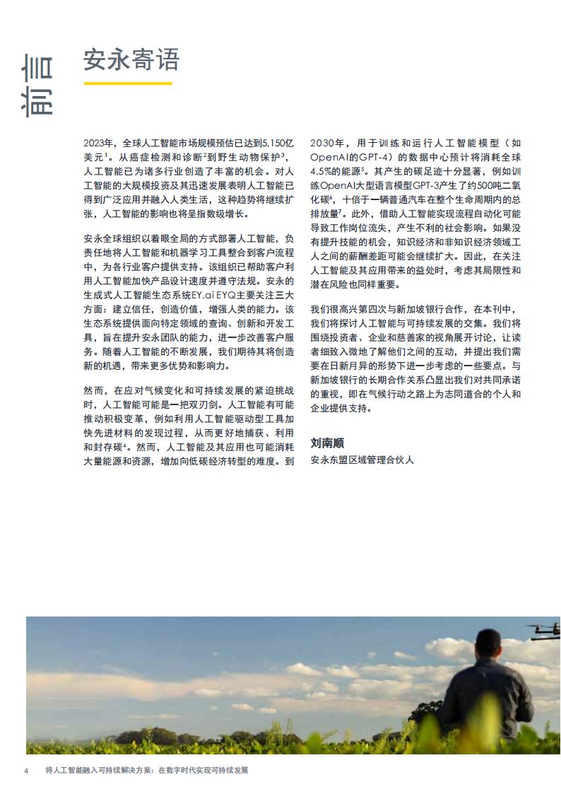 安永全球组织以着眼全局的方式部署人工智能,负责任地将人工智能和机器学习工具整合到客户流程中,为各行业客户提供支持。该组织已帮助客户利用人工智能加快产品设计速度并遵守法规。安永的生成式人工智能生态系统EY.ai EYQ主要关注三大方面:建立信任,创造价值,增强人类的能力。该生态系统提供面向特定领域的查询、创新和开发工具,旨在提升安永团队的能力,进一步改善客户服务。随着人工智能的不断发展,我们期待其将创造新的机遇,带来更多优势和影响力。