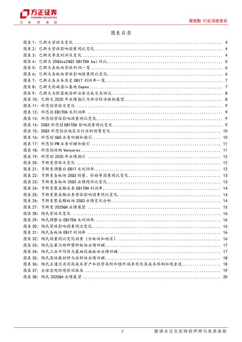 2025Q3巴斯夫、科思创、亨斯曼、陶氏营收同比-3%、-12%、-5%、-8%,EBITDA同比-5%(特殊项目前)、-16%、-28%、-37%。看营收影响因素,各公司销量同比+2%、-3%(PM板块)、+4%(PU 板块)、+2%(1I&I板块含PU),价格同比-2%、-10%(PM板块)、-10%(PU板块)、-8%(11&I板块含PU)。营收与利润下滑主要受产品价格普遍下行、汇率不利影响及部分区域需求疲软拖累,其中建筑与工业市场整体持续低迷,而汽车需求支撑有限。分区域看,亚太地区仍是增长主要驱动力,欧洲地区能源成本高企、需求疲软及装置运行问题则持续影响企业表现,美国本土 MDI 工厂短期受益于其关税壁垒,但建材保温需求侧受高利率影响较为低迷。