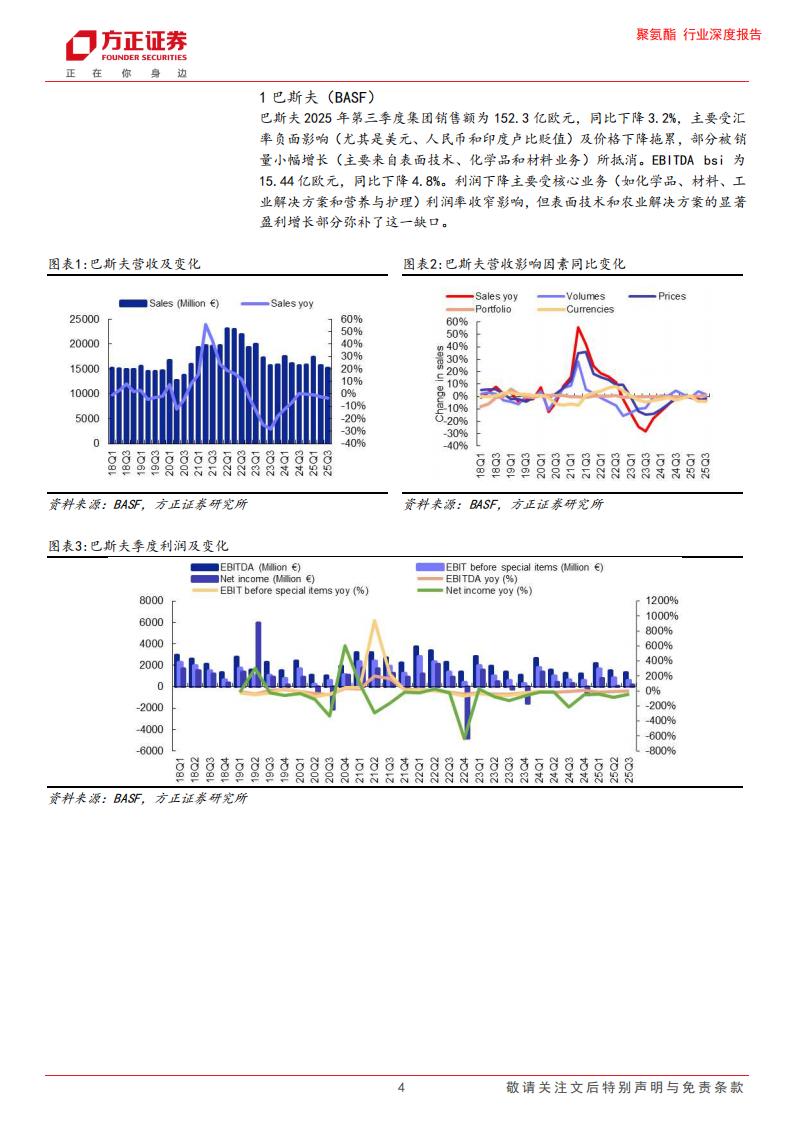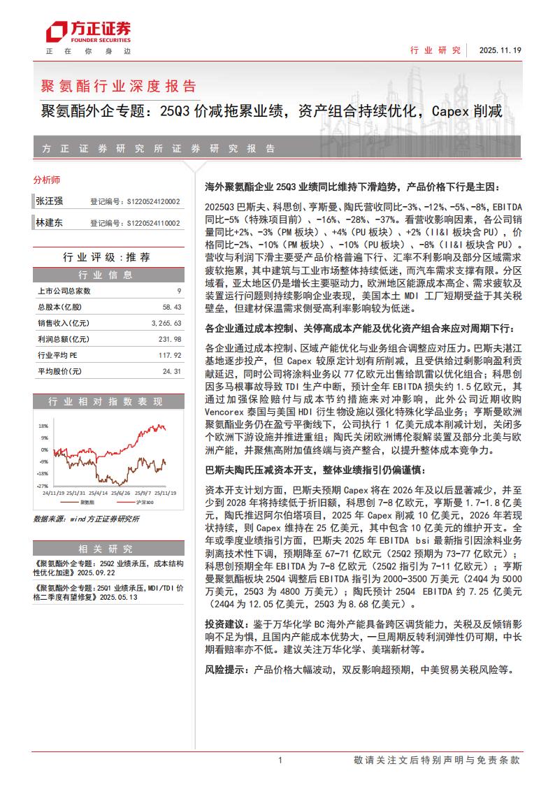 海外聚氨酯企业25Q3业绩同比维持下滑趋势,产品价格下行是主因: