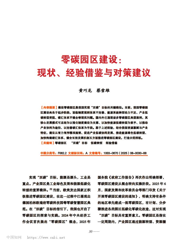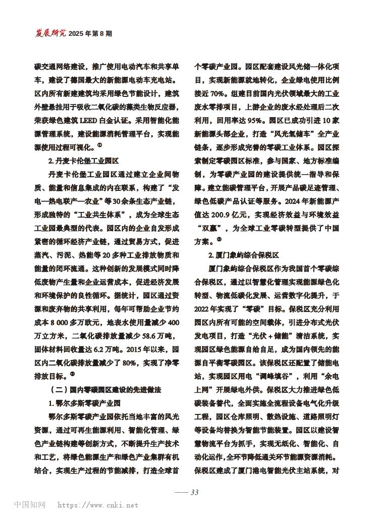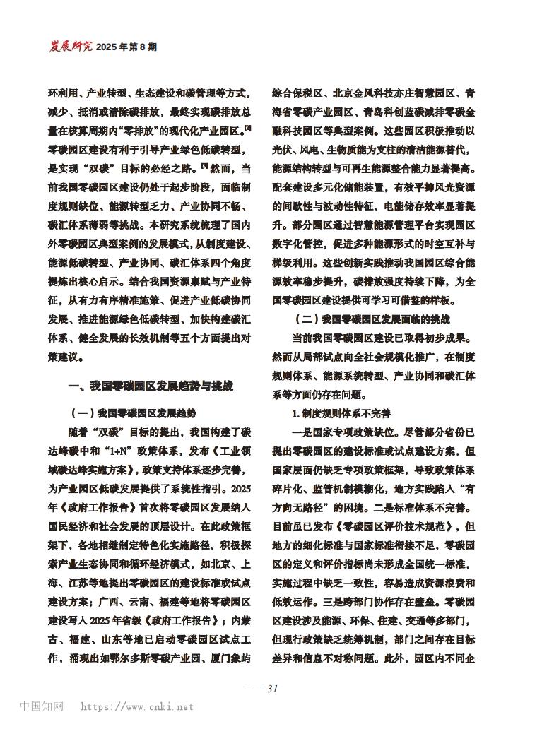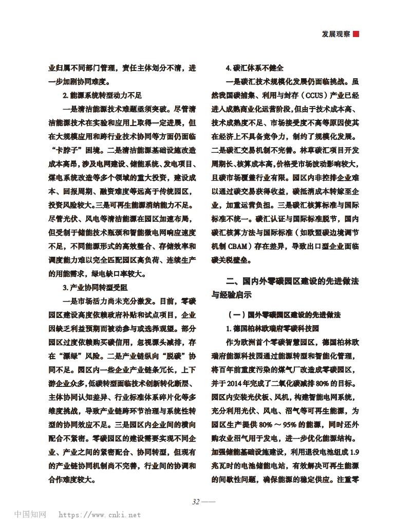 【关键词】零碳园区 “双碳”目标 低碳转型 经验借鉴实现“双碳”目标,能源是源头,工业是重点。产业园区是工业绿色发展和能源低碳化转型的重要载体。当前,欧美发达国家正积极推进零碳园区建设,在这一过程中已涌现出德国柏林欧瑞府零碳科技园等零碳智慧园区典范。在“双碳”目标的指引下,我国也开启了零碳园区的探索与实践。2024年中央经济工作会议首次提出“零碳园区”概念,2025年国务院《政府工作报告》再次作出明确部署,零碳园区建设从概念转向实操阶段。2025年6月,国家发展和改革委员会等部门印发《关于开展零碳园区建设的通知》,明确支持有条件的地区率先建成一批零碳园区,有计划、分步骤推进各类园区低碳化零碳化改造,这对实现“双碳”目标具有重要意义。零碳园区是指在一定周期内,产业园区通过能源转型、资源循环利用、产业转型、生态建设和碳管理等方式,减少、抵消或清除碳排放,最终实现碳排放总量在核算周期内“零排放”的现代化产业园区。2零碳园区建设有利于引导产业绿色低碳转型,是实现“双碳”目标的必经之路。3然而,当前我国零碳园区建设仍处于起步阶段,面临制度规则缺位、能源转型乏力、产业协同不畅、碳汇体系薄弱等挑战。本研究系统梳理了国内外零碳园区典型案例的发展模式,从制度建设、能源低碳转型、产业协同、碳汇体系四个角度提炼出核心启示。结合我国资源禀赋与产业特征,从有力有序精准施策、促进产业低碳协同发展、推进能源绿色低碳转型、加快构建碳汇体系、健全发展的长效机制等五个方面提出对策建议。