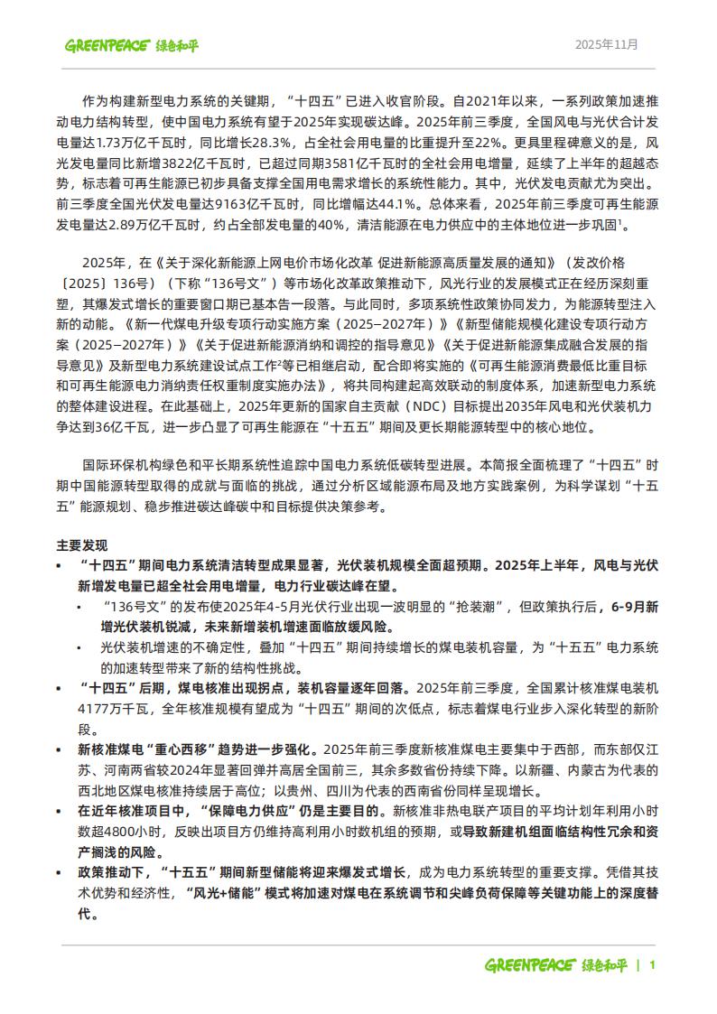 国际环保机构绿色和平长期系统性追踪中国电力系统低碳转型进展。本简报全面梳理了“十四五”时期中国能源转型取得的成就与面临的挑战,通过分析区域能源布局及地方实践案例,为科学谋划“十五五”能源规划、稳步推进碳达峰碳中和目标提供决策参考。