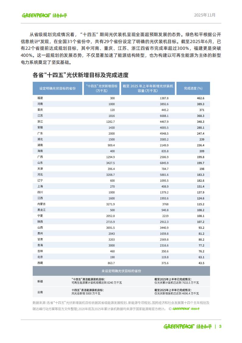 “十四五”期间,可再生能源发展在装机规模方面取得了历史性突破。截至2025年9月底,全国发电装机总容量已达37.2亿千瓦,其中可再生能源装机容量占比达到59.1%³。2025年第一季度,风电与光伏发电总装机容量首次超过火电⁴,标志着电力系统结构转型迈入新阶段。在新增装机方面,“十四五”以来结构优化成效显著。截至2025年7月底,全国新增装机总量的80%源自风光发电⁵。从省份层面看,与2020年相比,截至2025年6月所有省份光伏装机均实现翻倍增长,广西、云南等省份增幅更达十倍以上,充分反映出全国清洁能源发展的全面提速。从省级规划完成情况看,“十四五”期间光伏装机呈现全面超预期发展的态势。绿色和平根据公开信息统计发现,在全国31个省份中,共有29个省份设定了明确的光伏装机目标。截至2025年6月,已有22个省提前达成规划目标,其中河南、重庆、江苏、浙江四省市完成率超过300%,福建更是突破400%。这一超规划的发展态势,不仅显著加速了能源结构转型,也为构建以可再生能源为主体的新型电力系统奠定了坚实基础。