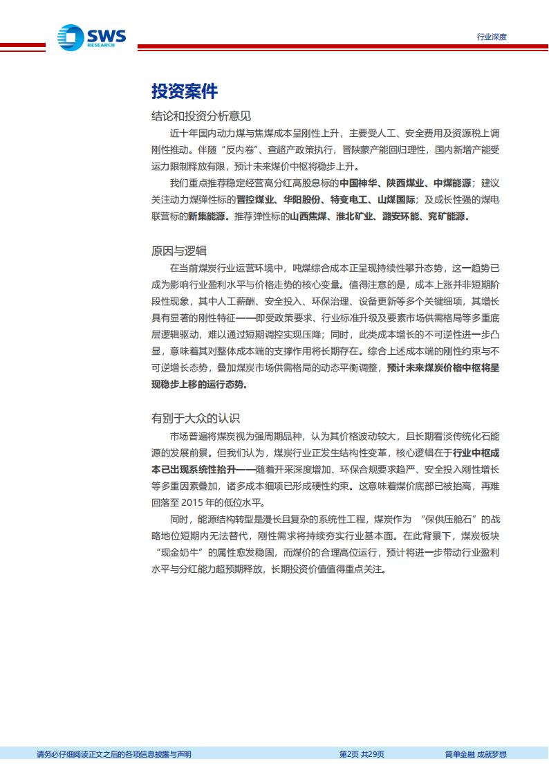 价的底部位置。成本上涨并非短期阶段性现象,其中人工薪酬、安全投入、环保治理、设备更新等多个关键细项,其增长具有显著的刚性特征——即受政策要求、行业标准升级及要素市场供需格局等多重底层逻辑驱动,难以通过短期调控实现压降,这意味着其对整体成本端的支撑作用将长期存在。叠加煤炭市场供需格局的动态平衡调整,预计未来煤炭价格中枢将呈现稳步上移的运行态势。