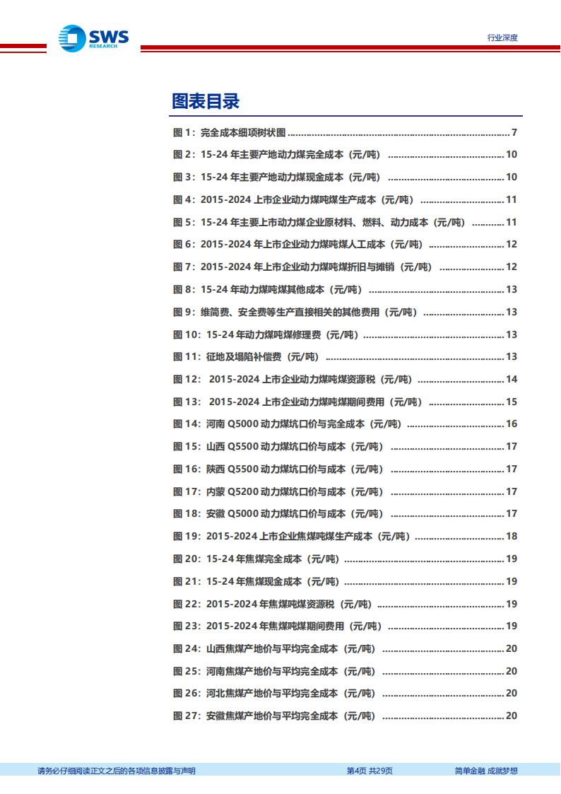 吨增长至306元/吨,年化增幅(CAGR)4.0%,其中生产成本均值由161元/吨增长至231元吨。主要增量贡献来源于原材料及燃料成本(+11%)、人工成本(+39%)、折旧摊销(+21%)、其他成本(+65%),部分成本具备一定刚性,如安全费计提标准政策上调,及井工条件限制。上述五省资源税受煤价和政策两方面影响,近十年呈波动上升趋势,由10元/吨增长至35元/吨,其中2024年晋陕蒙吨煤资源税分别为44/50/35元/吨;河南/安徽分为同一梯度,为10/12元/吨。伴随2024年山西资源税率上调,我们认为未来其他地区或存在补充财政收入或对标晋陕蒙的考虑,税率改革刚性提高。近十年动力煤企业期间费用由45元/吨下降至40元/吨,较稳定。