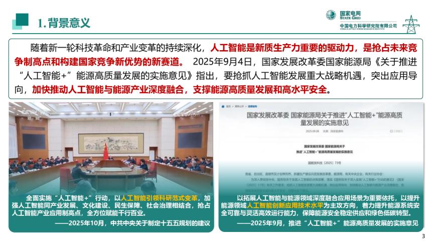 向,加快推动人工智能与能源产业深度融合,支撑能源高质量发展和高水平安全。到2030年,人工智能技术将实现跨领域、跨行业、跨业务场景赋能,在电力智能调控、新能源智能预测等方向取得突破,具身智能、科学智能等关键场景实现落地应用。《十五五规划建议》明确提出要引领科研范式变革,以大模型、智能计算等重构科学研究与工程开发路径。人工智能将成为新一轮科技和产业革命的核心驱动力,以及支撑新型电力系统建设的核心技术之一。