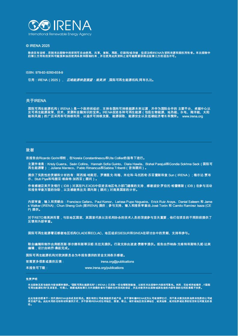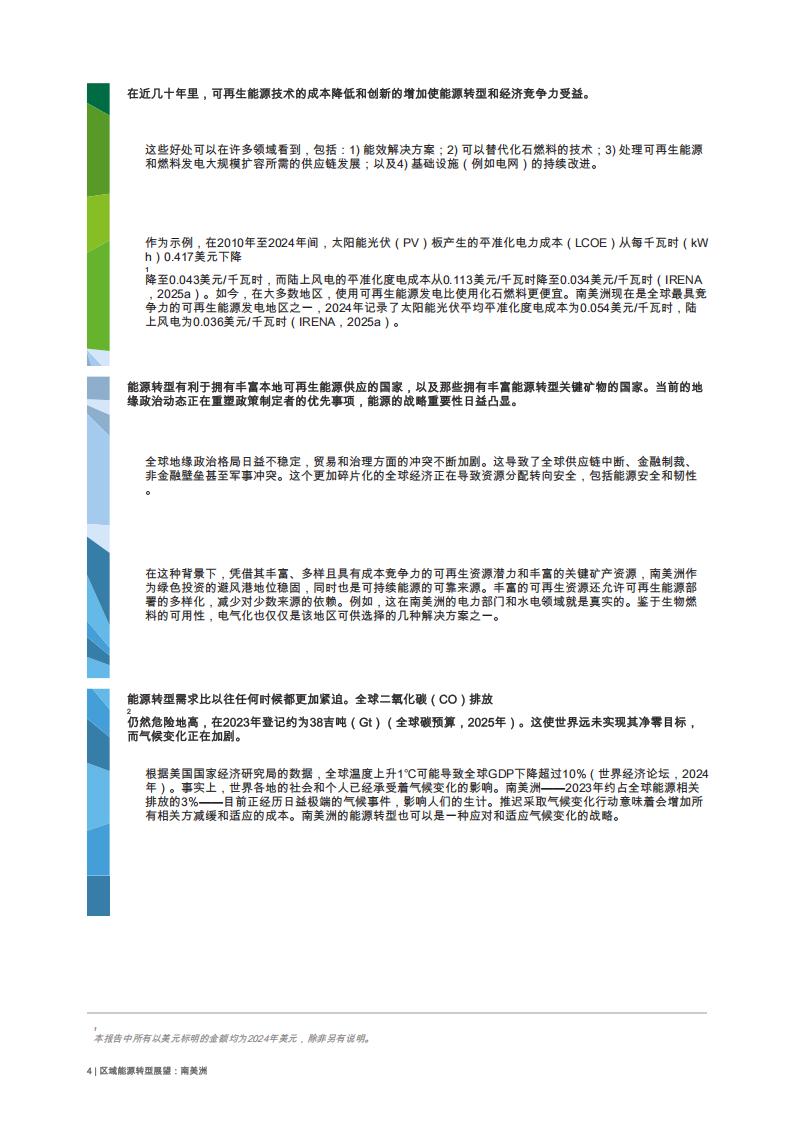 降至0.043美元/千瓦时,而陆上风电的平准化度电成本从0.113美元/千瓦时降至0.034美元/千瓦时(IRENA,2025a)。如今,在大多数地区,使用可再生能源发电比使用化石燃料更便宜。南美洲现在是全球最具竞争力的可再生能源发电地区之一,2024年记录了太阳能光伏平均平准化度电成本为0.054美元/千瓦时,陆上风电为0.036美元/千瓦时(IRENA,2025a)。