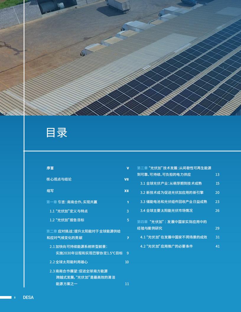 近年来,光伏与电池储能技术迅猛发展,其应用领域日益广泛、能效持续提升、成本不断下降,正惠及发展中国家的众多产业、社区和家庭。联合国经济和社会事务部荣幸发布这份综合性的全球“光伏加”报告。本报告展示了太阳能技术在农业、工业、城乡供电等领域的实践案例,这些经验可在全球南方众多发展中国家广泛推广复制。这些“光伏加”案例展现了不牺牲自然资源、环境与气候的情况下,也能推动当地经济社会进步、实现可持续发展目标的可行性和发展路径。报告分析了“光伏加”在南南合作中蕴含的多重机遇与效益,为创新合作模式与协作机制提供了重要启迪。