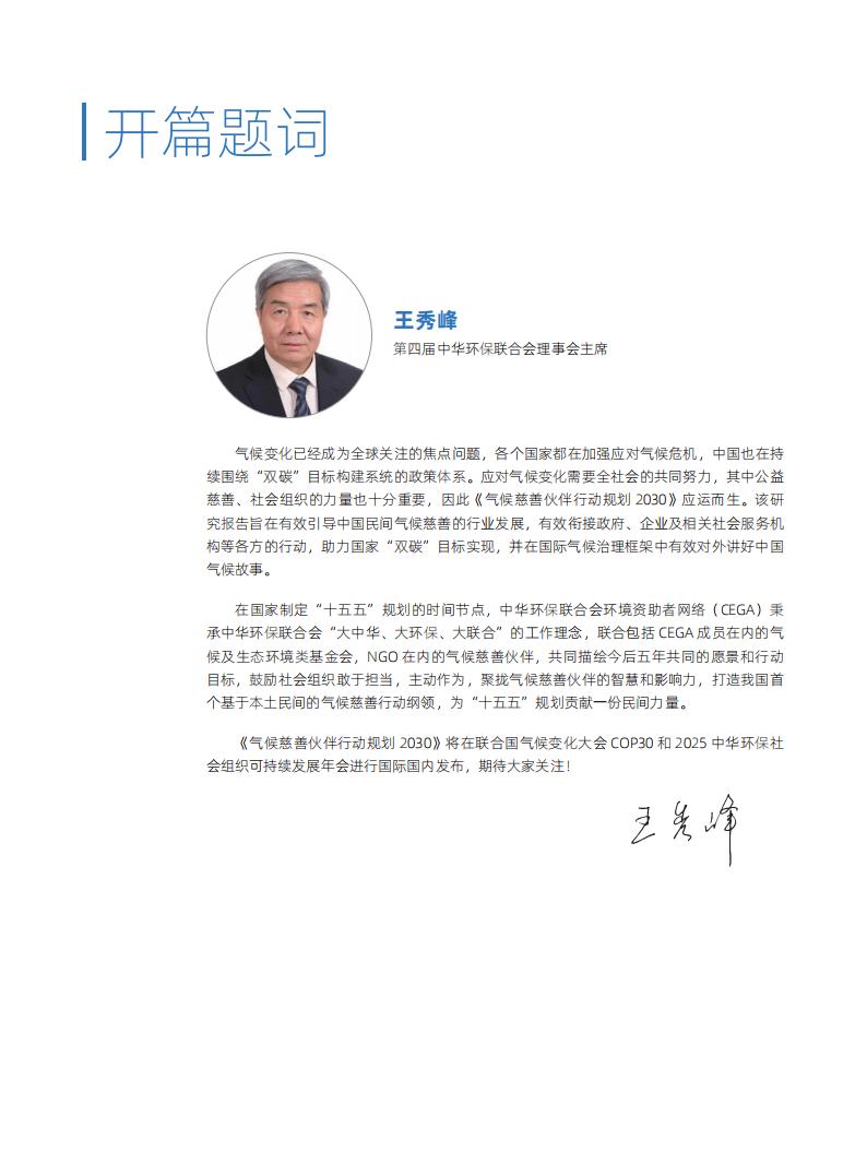 作为气候慈善伙伴计划项目的一项重要工作,在国家“十四五”规划圆满收官,“十五五”蓝图规划开启之际,我们怀着兴奋的心情向大家呈上这份《气候慈善伙伴行动规划2030》报告。
