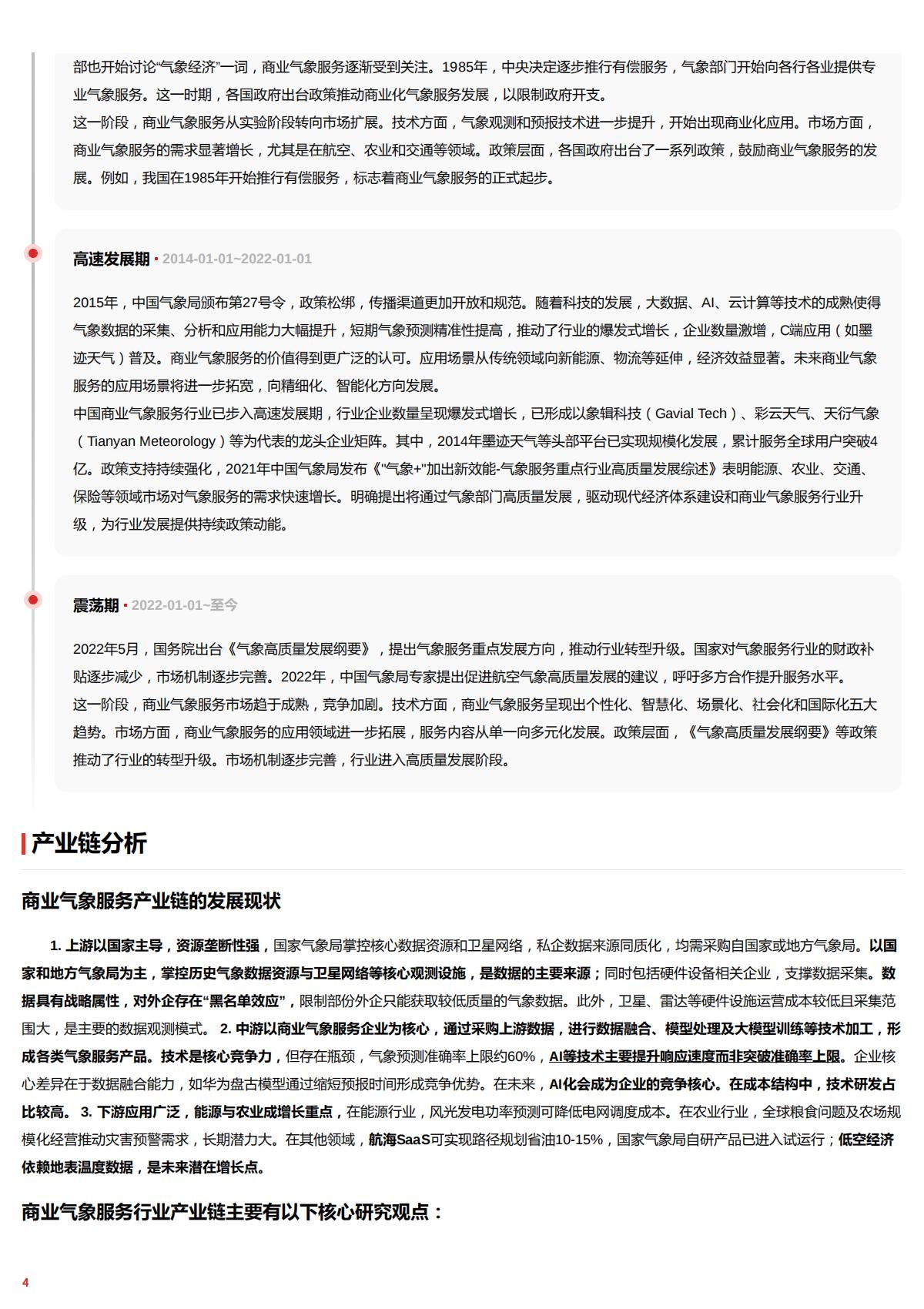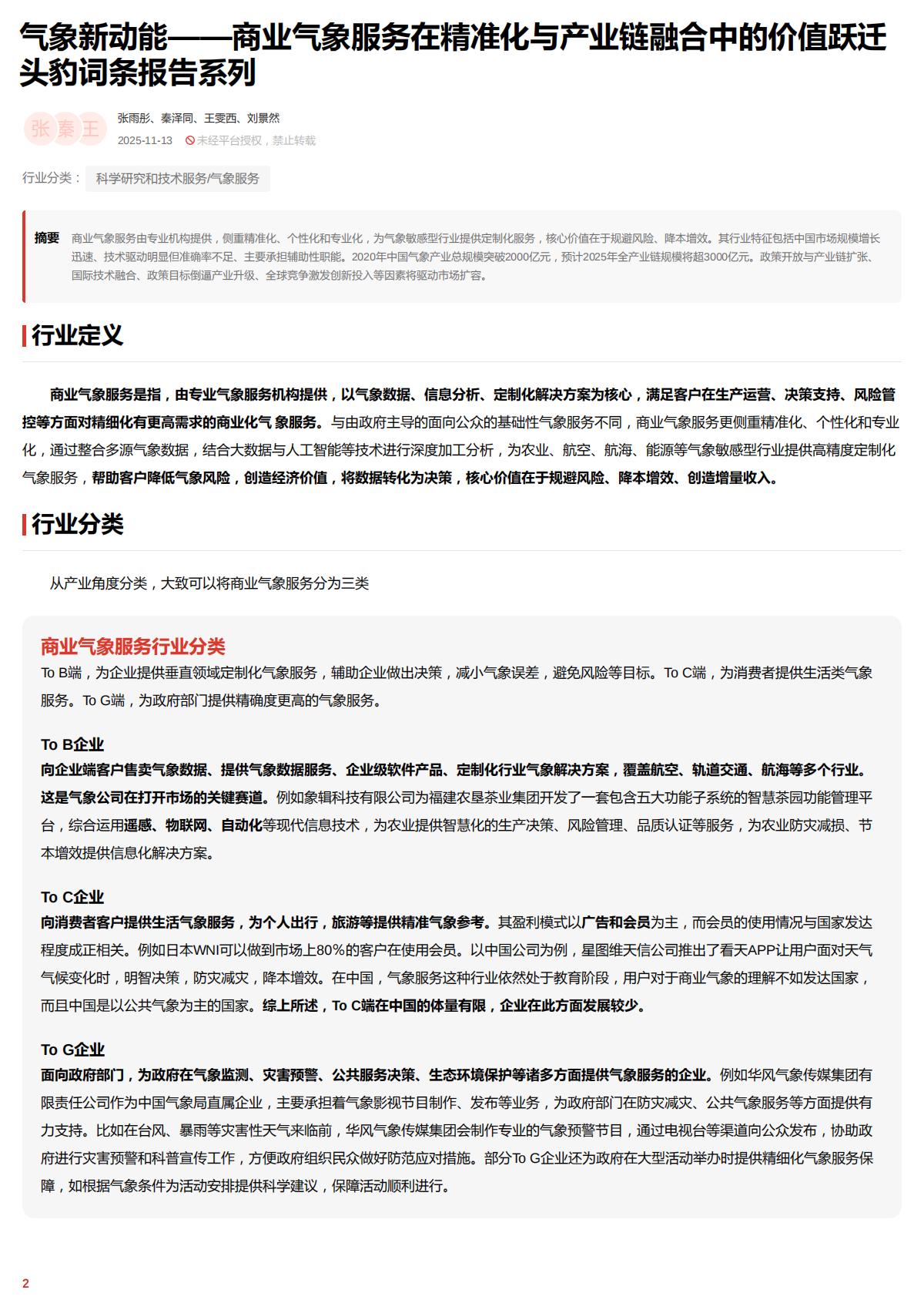 商业气象服务是指,由专业气象服务机构提供,以气象数据、信息分析、定制化解决方案为核心,满足客户在生产运营、决策支持、风险管I行业分类控等方面对精细化有更高需求的商业化气象服务。与由政府主导的面向公众的基础性气象服务不同,商业气象服务更侧重精准化、个性化和专业化,通过整合多源气象数据,结合大数据与人工智能等技术进行深度加工分析,为农业、航空、航海、能源等气象敏感型行业提供高精度定制化气象服务,帮助客户降低气象风险,创造经济价值,将数据转化为决策,核心价值在于规避风险、降本增效。创造增量收入.