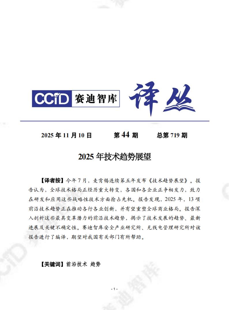 【译者按】今年7月,麦肯锡连续第五年发布《技术趋势展望》。报告认为,全球技术格局正经历重大转变,各国和各企业正争相发力,致力在研发和应用这些战略性技术方面抢占先机。报告发现,2025年,13项前沿技术趋势正在推动各行各业创新,并有望重塑全球商业格局。报告深入剖析这些最具变革潜力的前沿技术趋势,揭示了技术发展的趋势、最新进展及关键不确定性。赛迪智库安全产业研究所、无线电管理研究所对该报告进行了编译,期望对我国有关部门有所帮助。