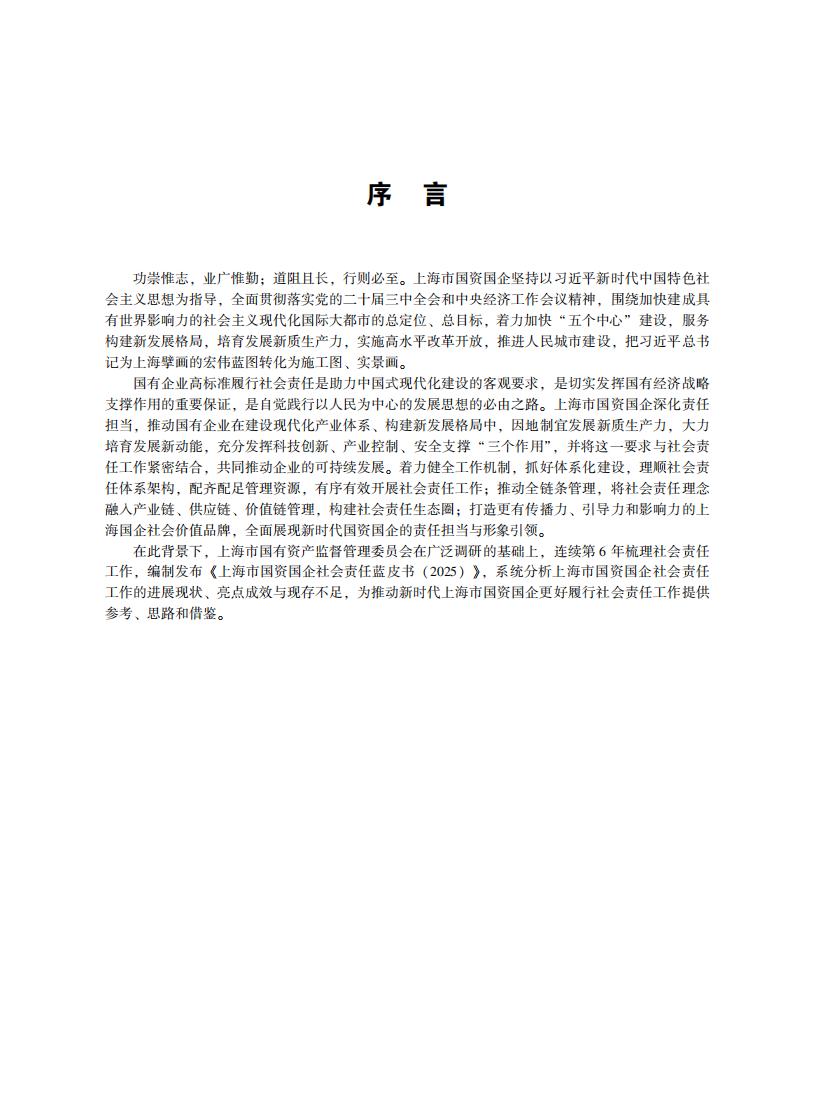 在此背景下,上海市国有资产监督管理委员会在广泛调研的基础上,连续第6年梳理社会责任工作,编制发布《上海市国资国企社会责任蓝皮书(2025)》,系统分析上海市国资国企社会责任工作的进展现状、亮点成效与现存不足,为推动新时代上海市国资国企更好履行社会责任工作提供参考、思路和借鉴。