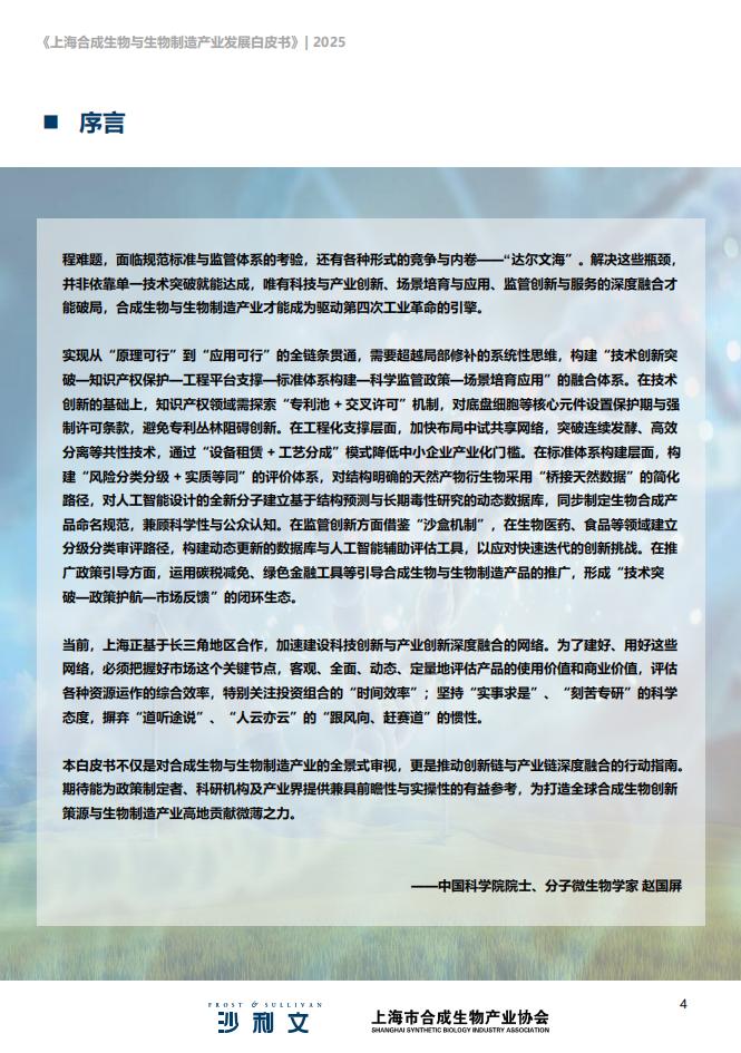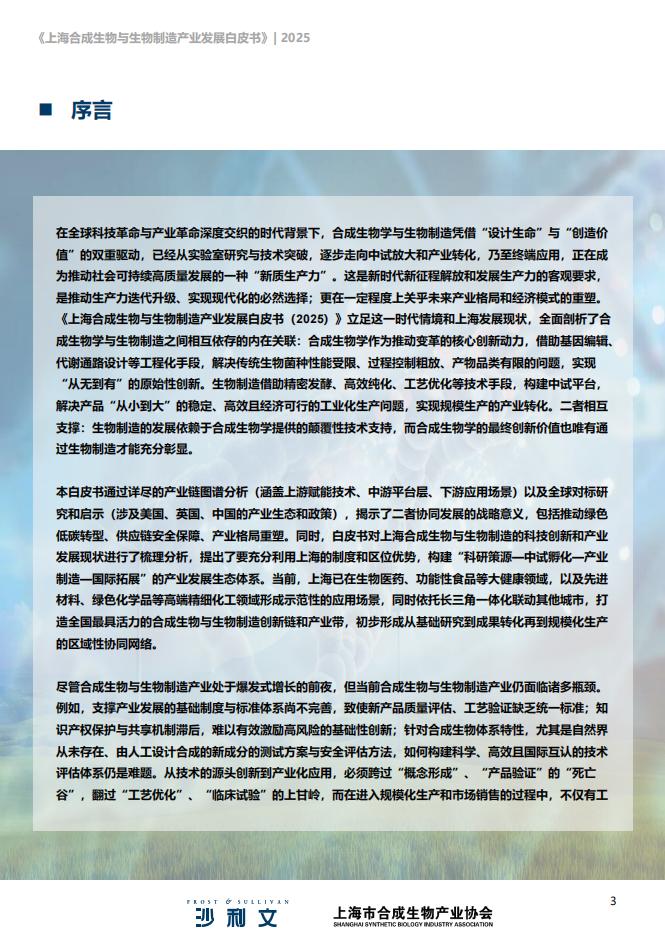 合成生物学被誉为是继“DNA双螺旋结构”和“基因组技术”之后的第三次生命科学革命,被认为是生前期,本白皮书编写委员会依托上海市合成生物产业协会的平台优势与弗若斯特沙利文的研究经验,通过《上海合成生物与生物制造产业发展白皮书(2025)》将是一份专业、权威且具备宏观战略视野的研究报命科学研究的一种新范式,更是生物制造与生物经济领域变革性发展的核心驱动力。发展合成生物学和生“政-产-学-研-金-用”的紧密合作与深入调研,洞察各主体发展现状及需求,挖掘并总结上海市的资源禀告,旨在为政府机构、投资机构、产业界以及社会各界,提供启示与参考,助力上海至2030年,建设成为物制造产业,高度契合我国可持续发展的重大战略需求,当前我国正加大力度从技术研发到产业布局实现赋及核心竞争优势,并通过海内外创新平台与团队、园区以及企业的对标分析,积极探索上海市未来可行合成生物全球创新策源高地、国际成果转化枢纽和国际高端智造中心,以及具有全球影响力的高端生物制全链条推进。全国多地相继出台相关政策,通过资金扶持、产业集聚和技术创新等举措,推动合成生物与的发展模式与路径,促进全产业的深度融合与良性发展,进而提出产业发展策略建议。造产业集群。生物制造产业从战略规划不断纵深向多领域发展。在全球科技革命与产业革命深度交织的时代背景下,合成生物学与生物制造凭借“设计生命”与“创造价值”的双重驱动,已经从实验室研究与技术突破,逐步走向中试放大和产业转化,乃至终端应用,正在成为推动社会可持续高质量发展的一种“新质生产力”。这是新时代新征程解放和发展生产力的客观要求,是推动生产力迭代升级、实现现代化的必然选择;更在一定程度上关乎未来产业格局和经济模式的重塑。《上海合成生物与生物制造产业发展白皮书(2025)》立足这一时代情境和上海发展现状,全面剖析了合成生物学与生物制造之间相互依存的内在关联:合成生物学作为推动变革的核心创新动力,借助基因编辑、代谢通路设计等工程化手段,解决传统生物菌种性能受限、过程控制粗放、产物品类有限的问题,实现“从无到有”的原始性创新。生物制造借助精密发酵、高效纯化、工艺优化等技术手段,构建中试平台,解决产品“从小到大”的稳定、高效且经济可行的工业化生产问题,实现规模生产的产业转化。二者相互支撑:生物制造的发展依赖于合成生物学提供的颠覆性技术支持,而合成生物学的最终创新价值也唯有通过生物制造才能充分彰显。