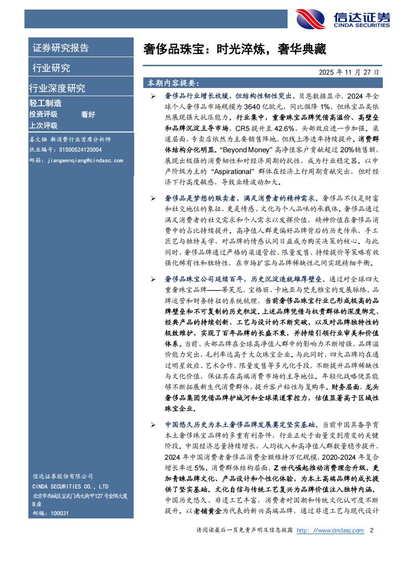 中国悠久历史为本土奢侈品牌发展奠定坚实基础。当前中国具备孕育本土奢侈珠宝品牌的多重有利条件,行业正处于由量变到质变的关键阶段。中国经济总量持续增长,人均收入和高净值人群数量稳步提升,2024年中国消费者奢侈品消费金额维持万亿规模,2020-2024年复合增长率近5%。消费群体结构层面,Z世代崛起推动消费理念升级,更加青睐品牌文化、产品设计和个性化体验,为本土高端品牌的成长提供了坚实基础。文化自信与传统工艺复兴为品牌价值注入独特内涵。中国历史悠久、非遗工艺丰富,消费者对国潮和传统文化认可度不断提升。以老铺黄金为代表的新兴高端品牌,通过非遗工艺与现代设计的结合,实现了品牌溢价与市场认可,上市后表现抢眼,成为本土奢侈珠宝品牌突围的典型案例。未来行业发展重点关注四大方向:一是持续深耕中华文化内涵与工艺创新,打造差异化产品壁垒;二是加快品牌建设和高端渠道渗透,提升品牌认知度与忠诚度;三是注重客户体验,实现高质量客户管理;四是权衡可得性与稀缺性、独特性的关系,如何在发展前期打响品牌知名度的同时维持品牌形象不滑落,是每一个新进玩家都要经历的考验。随着我国经济结构优化和文化自信增强,中国有望在未来孕育出具有全球影响力的奢侈品牌。
