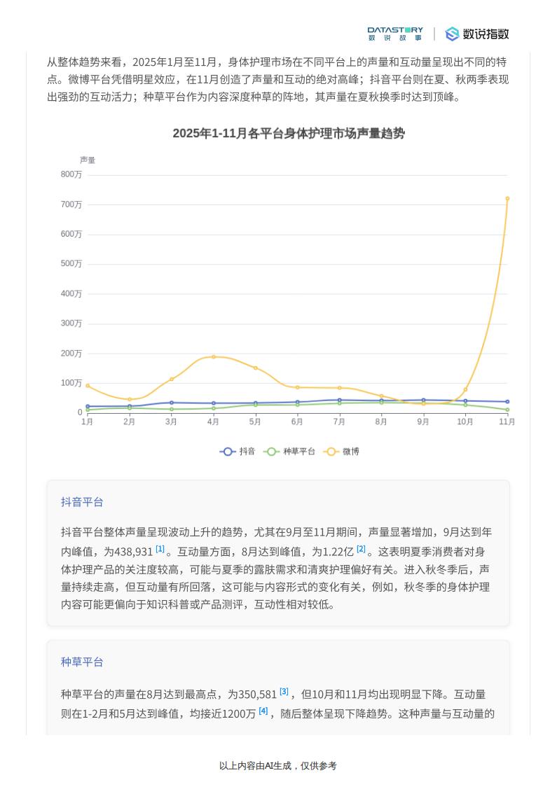 本章将全面分析2025年1月至今身体护理市场在抖音、种草平台和微博三大社交媒体上的声量与互动量趋势。通过定量数据呈现市场整体活跃度,并结合重大营销事件、季节性因素等进行定性解读,识别市场高峰与低谷及其驱动因素。
