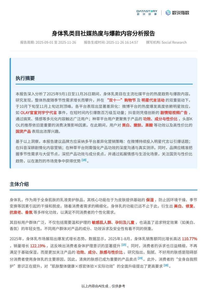 本报告深入分析了2025年9月1日至11月26日期间,身体乳类目在主流社媒平台的热度趋势与爆款内容。研究发现,整体热度随季节性需求增长而攀升,并在“双十一”购物节及明星代言活动的双重驱动下,于10月下旬至11月上旬达到顶峰。各平台表现出显著差异化:微博平台的热度爆发高度依赖明星效应,如OLAY官宣刘宇宁代言事件,在短时间内引爆数百万级互动量;抖音则凭借创新的剧情短视频广告,通过搞笑、情感等多元化内容触达广泛用户;种草平台用户更聚焦于产品的功效、成分与性价比,头部KOL的推荐依旧是重要的消费决策影响因素。在此期间,用户对美白、嫩肤、果酸等功效以及高性价比的国货产品表现出浓厚兴趣。