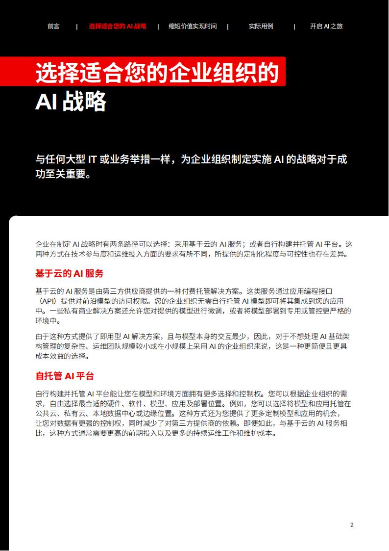 企业在制定AI战略时有两条路径可以选择:采用基于云的AI服务;或者自行构建并托管AI平台。这两种方式在技术参与度和运维投入方面的要求有所不同,所提供的定制化程度与可控性也存在差异。