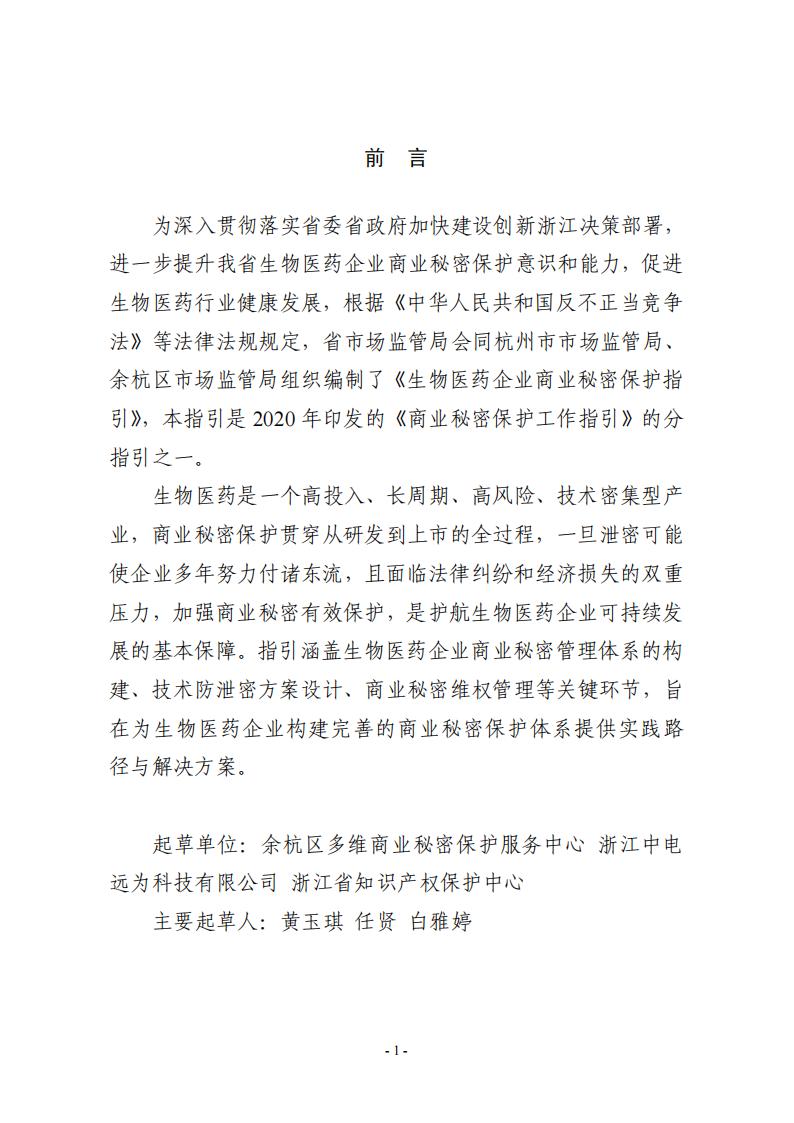 为深入贯彻落实省委省政府加快建设创新浙江决策部署,进一步提升我省生物医药企业商业秘密保护意识和能力,促进生物医药行业健康发展,根据《中华人民共和国反不正当竞争法》等法律法规规定,省市场监管局会同杭州市市场监管局、余杭区市场监管局组织编制了《生物医药企业商业秘密保护指引》,本指引是2020年印发的《商业秘密保护工作指引》的分指引之一。