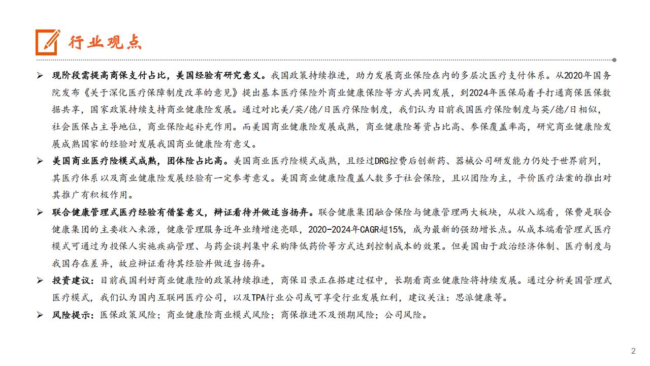 联合健康管理式医疗经验有借鉴意义,辩证看待并做适当扬弃。联合健康集团融合保险与健康管理两大板块,从收入端看,保费是联合健康集团的主要收入来源,健康管理服务近年业绩增速亮眼,2020-2024年CAGR超15%,成为最新的强劲增长点。从成本端看管理式医疗模式可通过为投保人实施疾病管理、与药企谈判集中采购降低药价等方式达到控制成本的效果。但美国由于政治经济体制、医疗制度与我国存在差异,故应辩证看待其经验并做适当扬弃。