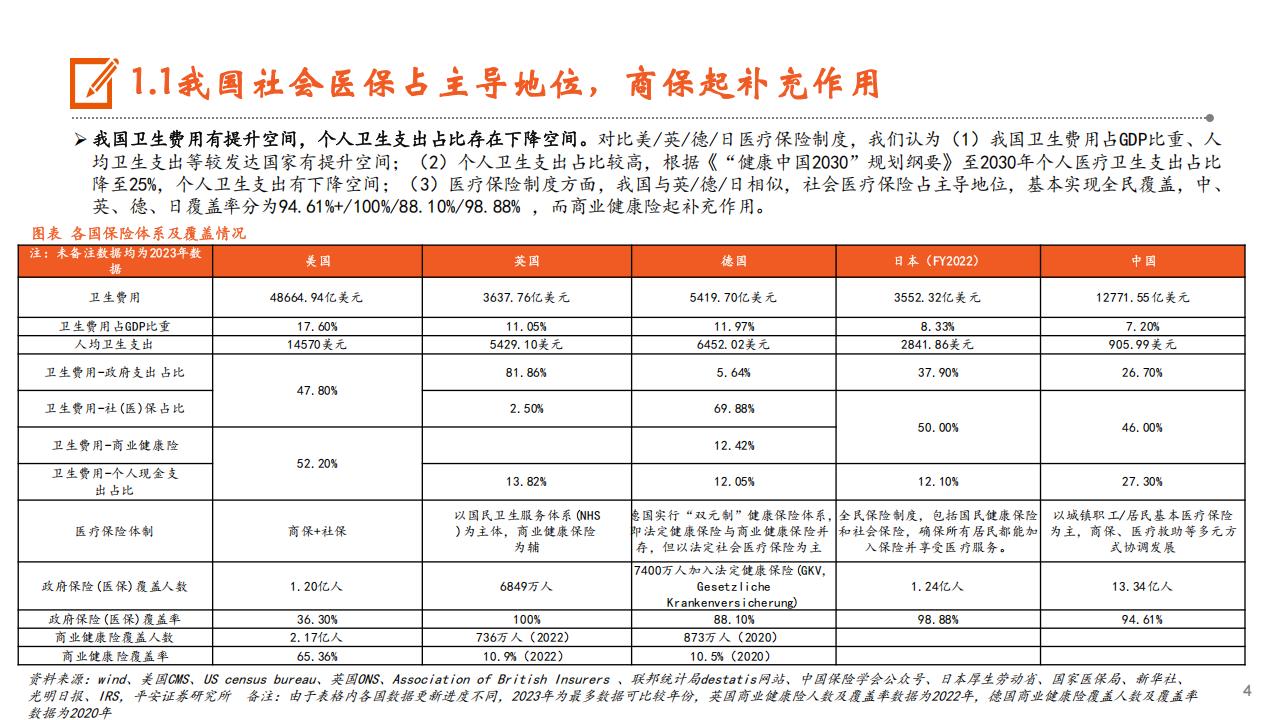 我国卫生费用有提升空间,个人卫生支出占比存在下降空间。对比美/英/德/日医疗保险制度,我们认为(1)我国卫生费用占GDP比重、人均卫生支出等较发达国家有提升空间;(2)个人卫生支出占比较高,根据《“健康中国2030”规划纲要》至2030年个人医疗卫生支出占比降至25%,个人卫生支出有下降空间;(3)医疗保险制度方面,我国与英/德/日相似,社会保险险占主导地位,基本实现全民覆盖,中、英、德、日覆盖率分为94.61%/100/88.10%/98.88%,而商业健康险起补充作用。