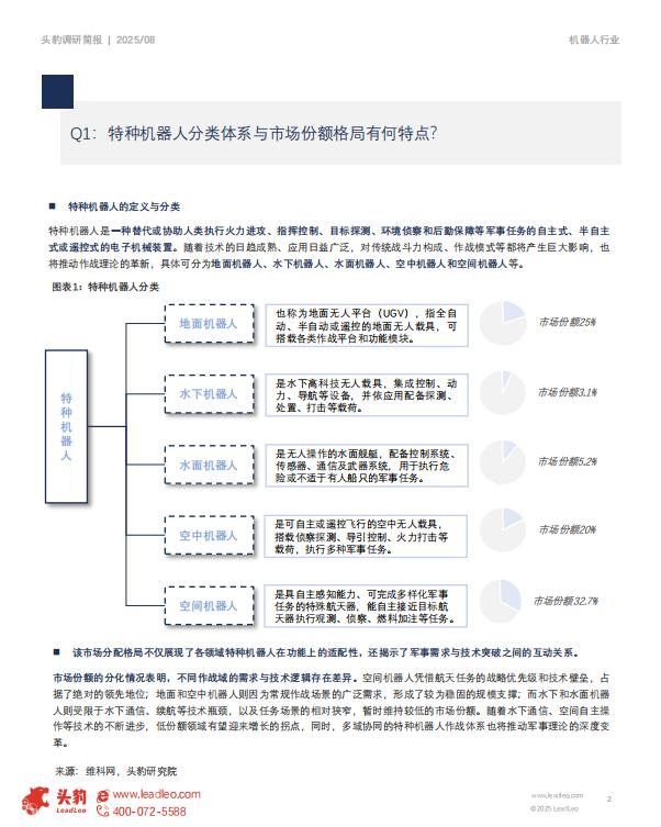 该市场分配格局不仅展现了各领域特种机器人在功能上的适配性,还揭示了军事需求与技术突破之间的互动关系。