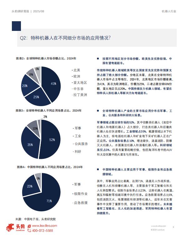 传统特种机器人领域欧美等发达国家受先发优势和预算支持占据了绝大部分份额。分地区来看,北美在全球特种机器人市场中占主导地位,2024年,北美地区市场份额最高,为41%,其次为欧洲地区,份额为25%,二者占据全球66%份额,亚太地区仅占20%。中国持续发力机器人领域,有望在特种兵人形机器人等新兴方向弯道超车。