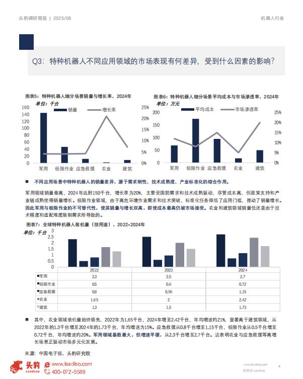 军用领域销量最高、2024年达到150千台,增长率为20%,主要受国防需求和技术成熟驱动。尽管成本高,但政策支持和产业链成熟使得销量增长。极限作业领域,由于高危环境作业需求和技术突破,标准化任务降低了应用门槛,推动了销量增长。因此军用与极限作业的不可替代性,使其销量与增长双高,即使成本最高仍被市场接受。农业和建筑领域销量低迷是由于技术精度和适配强度限制需求所导致的。