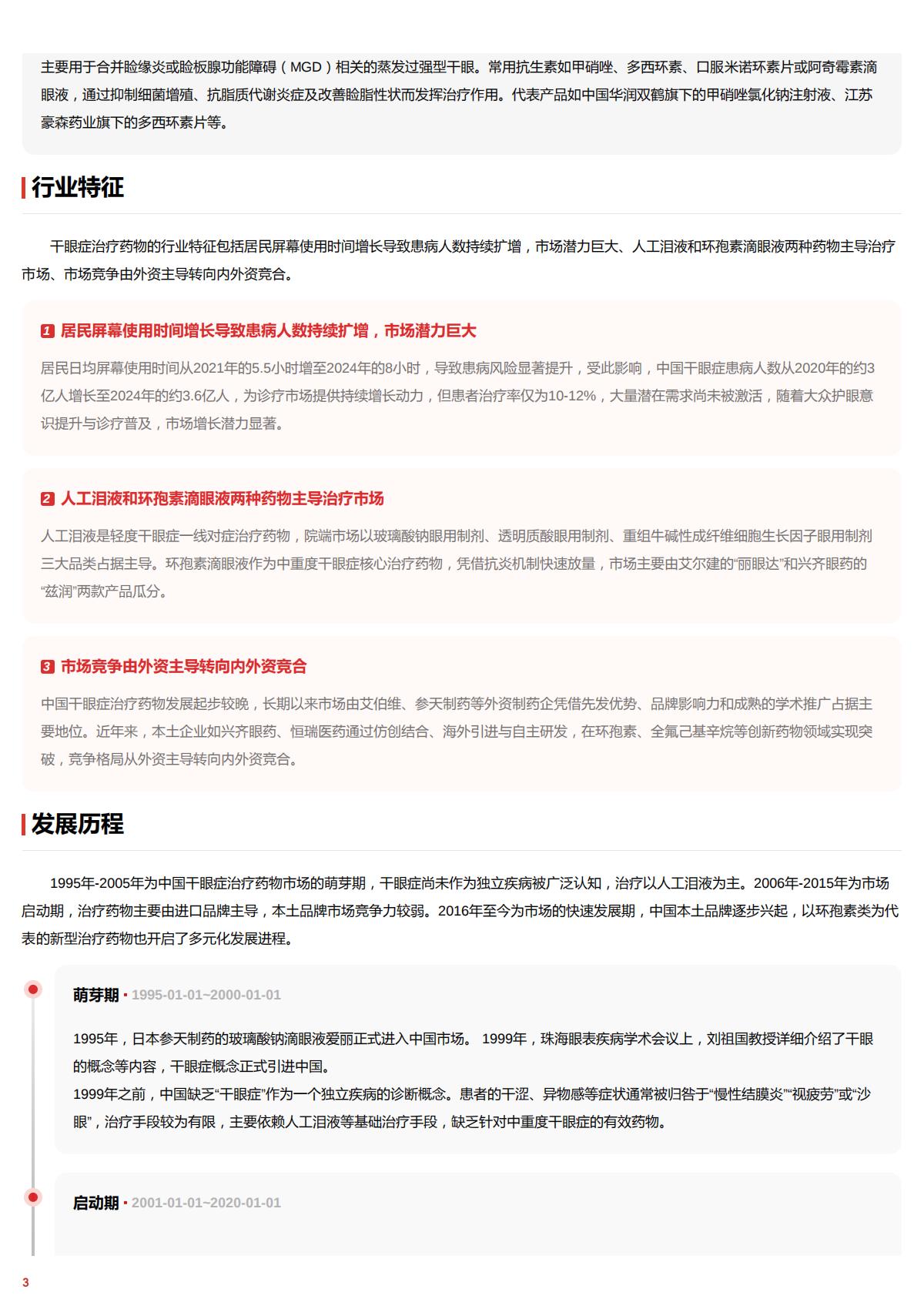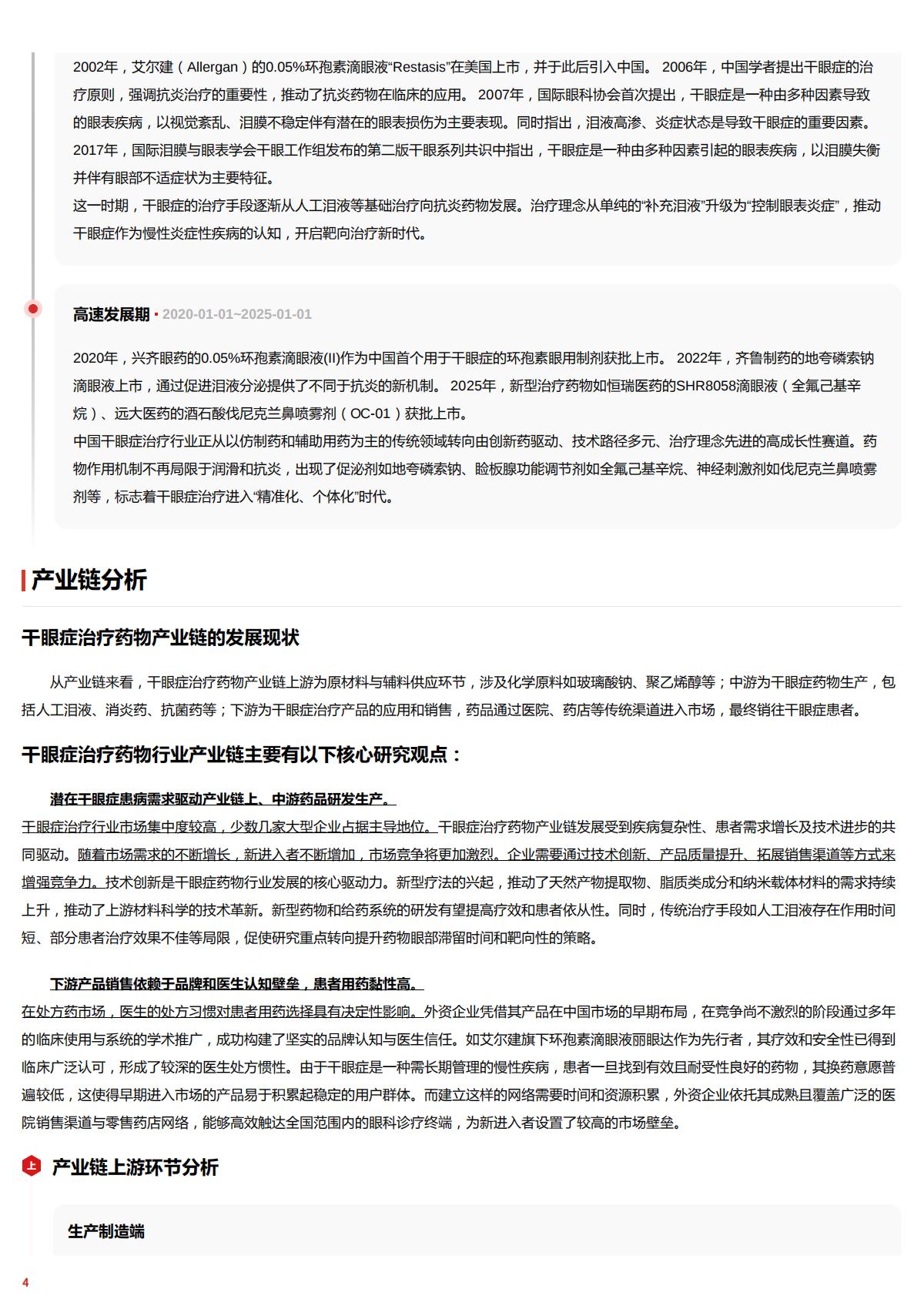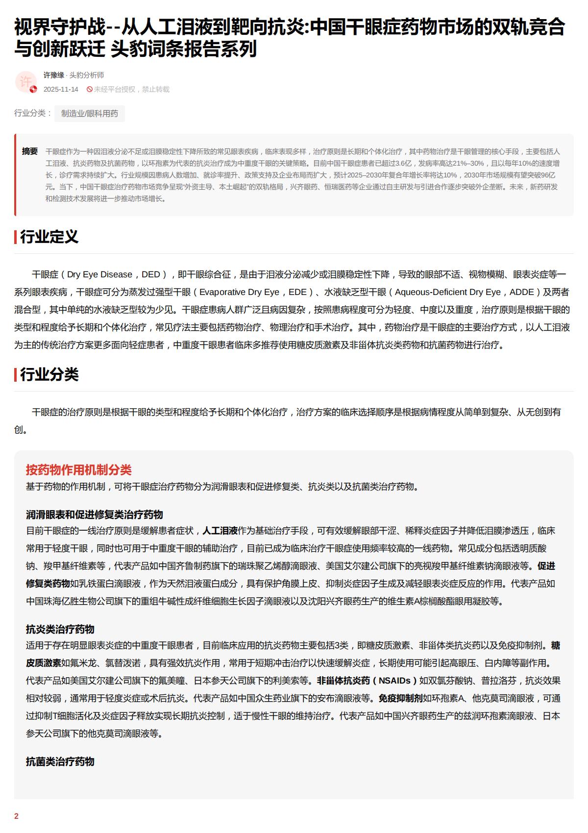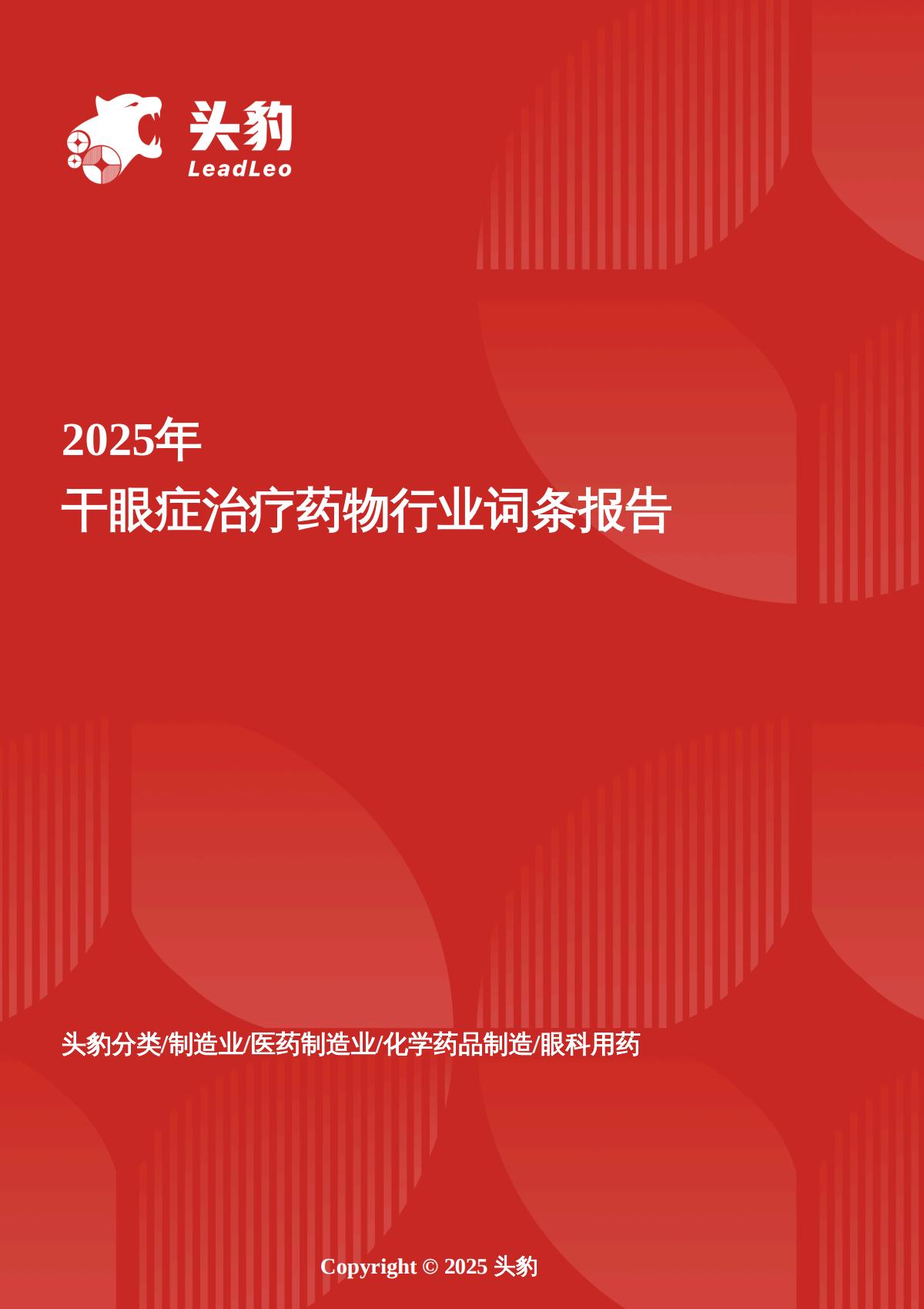 摘要干愿维作为一种因E被分泌不足或追眼稳定性下降所致的端见服表疾病,临床表现多样,治疗原见是长期和个体化治疗,其中药艳治疗是干眼管理的核心手段,主要包括人工拒液、抗淡药物及抗凿兹物,以环拖素为代表的淡治疗成为中重度干顺的关健第略。目前中国干眼症患者已超过36亿,发就率高达21%-30%,且以每年1C5%的速度增长,诊疗需求持续扩大,行业规根因患病人鼓增加、就诊率提升、政策支持及企业布局而扩大,预计Z025-2030年复合年增长率将达10%,ZC30年市场规模有望突装6Z元。当下,中国干眼症治疗药物市场竞争呈现外资主导、本土岖趁的双轨格局,兴齐眼燕、伍璃医热等企业通过白主研发与引进合作逐步突装外企茔断,未来,新热研发和检测技术发展将进一步签动市场增长。