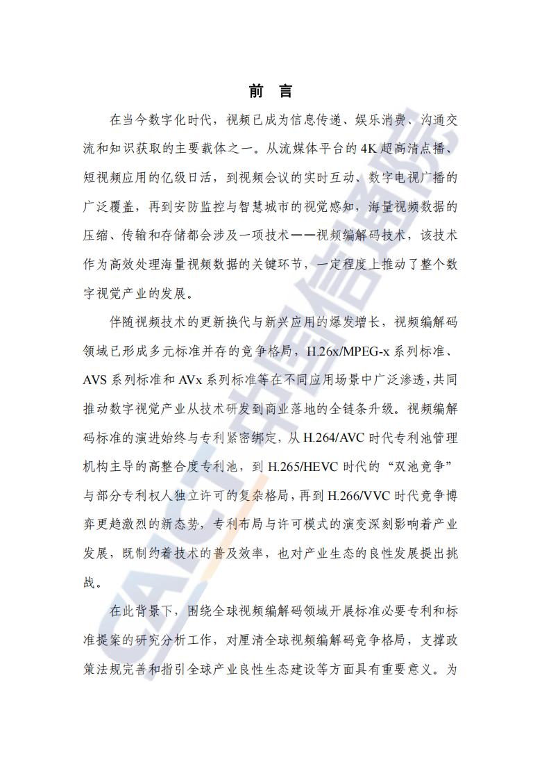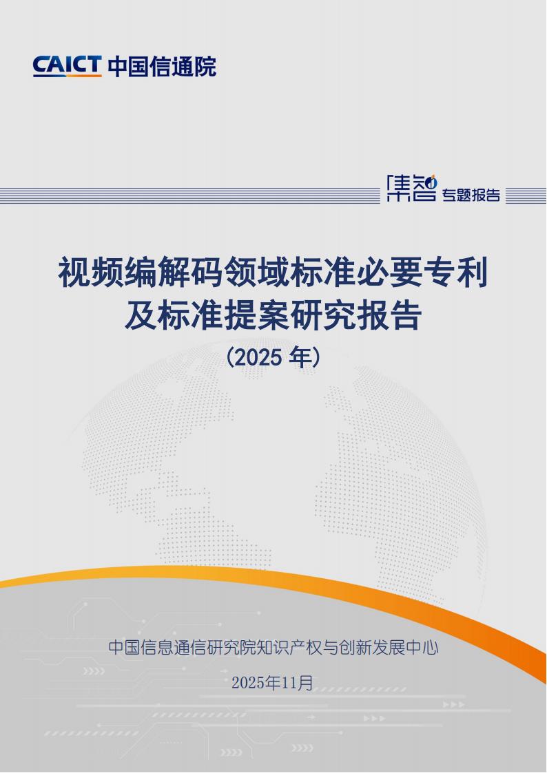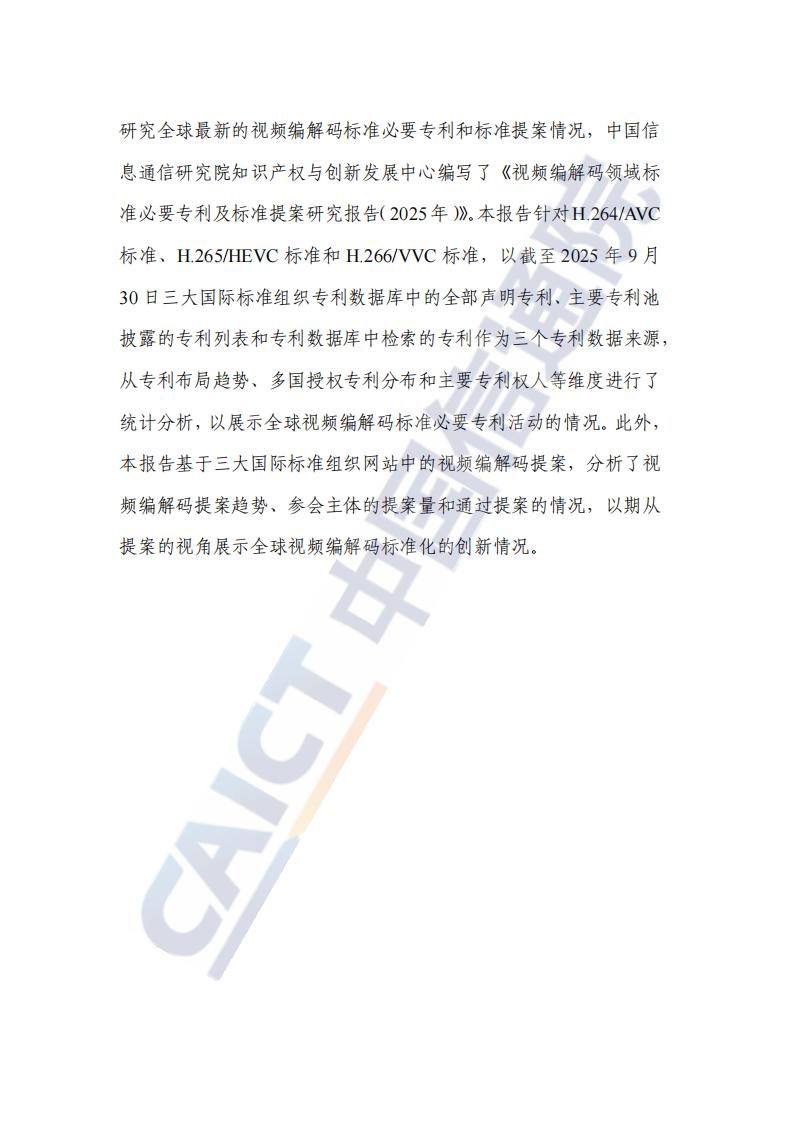 在此背景下,围绕全球视频编解码领域开展标准必要专利和标准提案的研究分析工作,对厘清全球视频编解码竞争格局,支撑政策法规完善和指引全球产业良性生态建设等方面具有重要意义。为研究全球最新的视频编解码标准必要专利和标准提案情况,中国信息通信研究院知识产权与创新发展中心编写了《视频编解码领域标准必要专利及标准提案研究报告(2025年)》。本报告针对H264/AVC标准、H.265/HEVC标准和H.266/VVC标准,以截至2025年9月30日三大国际标准组织专利数据库中的全部声明专利、主要专利池披露的专利列表和专利数据库中检索的专利作为三个专利数据来源,从专利布局趋势、多国授权专利分布和主要专利权人等维度进行了统计分析,以展示全球视频编解码标准必要专利活动的情况。此外,本报告基于三大国际标准组织网站中的视频编解码提案,分析了视频编解码提案趋势、参会主体的提案量和通过提案的情况,以期从提案的视角展示全球视频编解码标准化的创新情况。