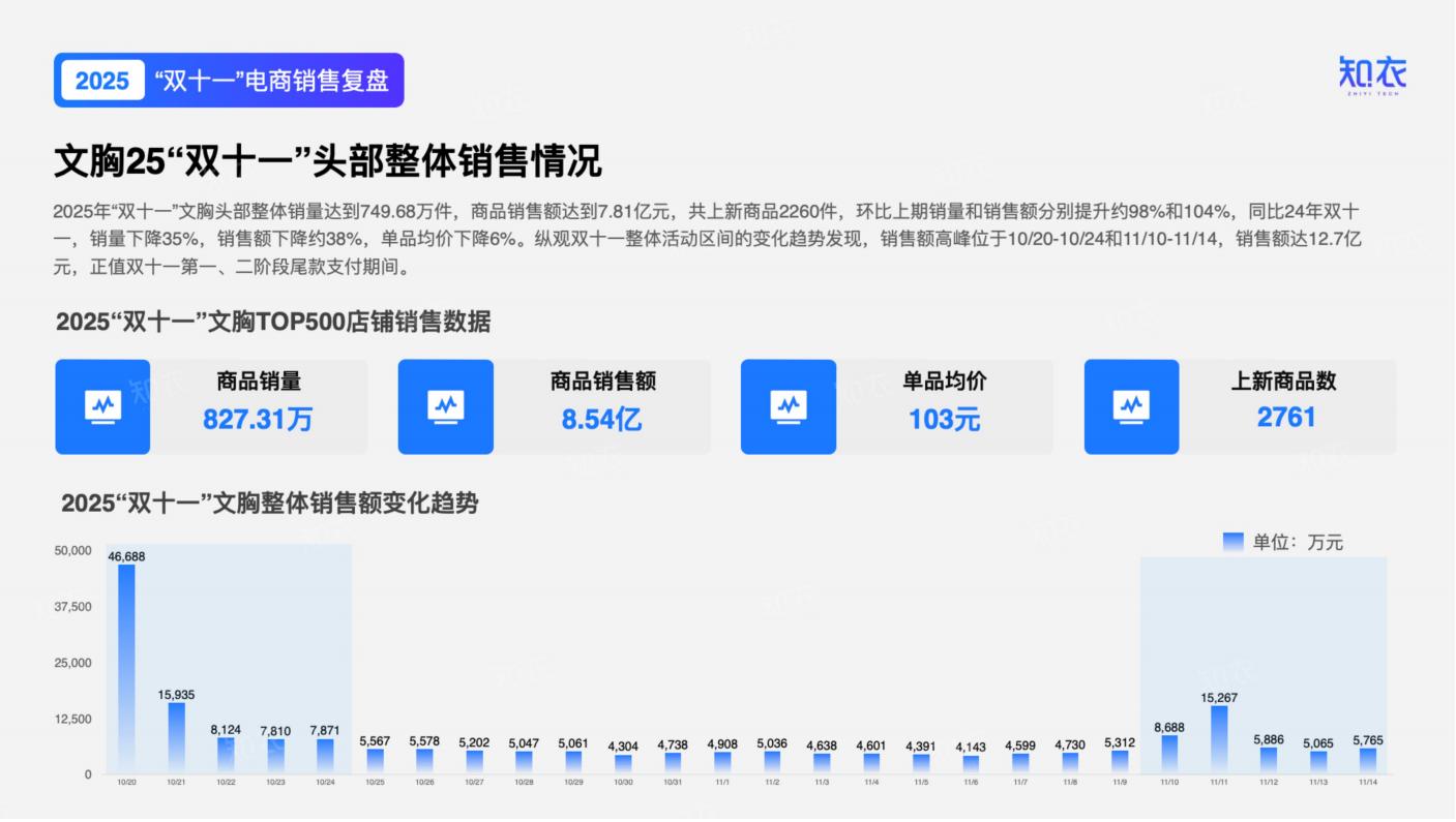 2025年“双十一”文胸头部整体销量达到749.68万件,商品销售额达到7.81亿元,共上新商品2260件,环比上期销量和销售额分别提升约98%和104%。同比24年双十一,销量下降35%,销售额下降约38%,单品均价下降6%。纵观双十一整体活动区间的变化趋势发现,销售额高峰位于10/20-10/24和11/10-11/14,销售额达12.7亿元,正值双十一、一、二阶段尾款支付期间。