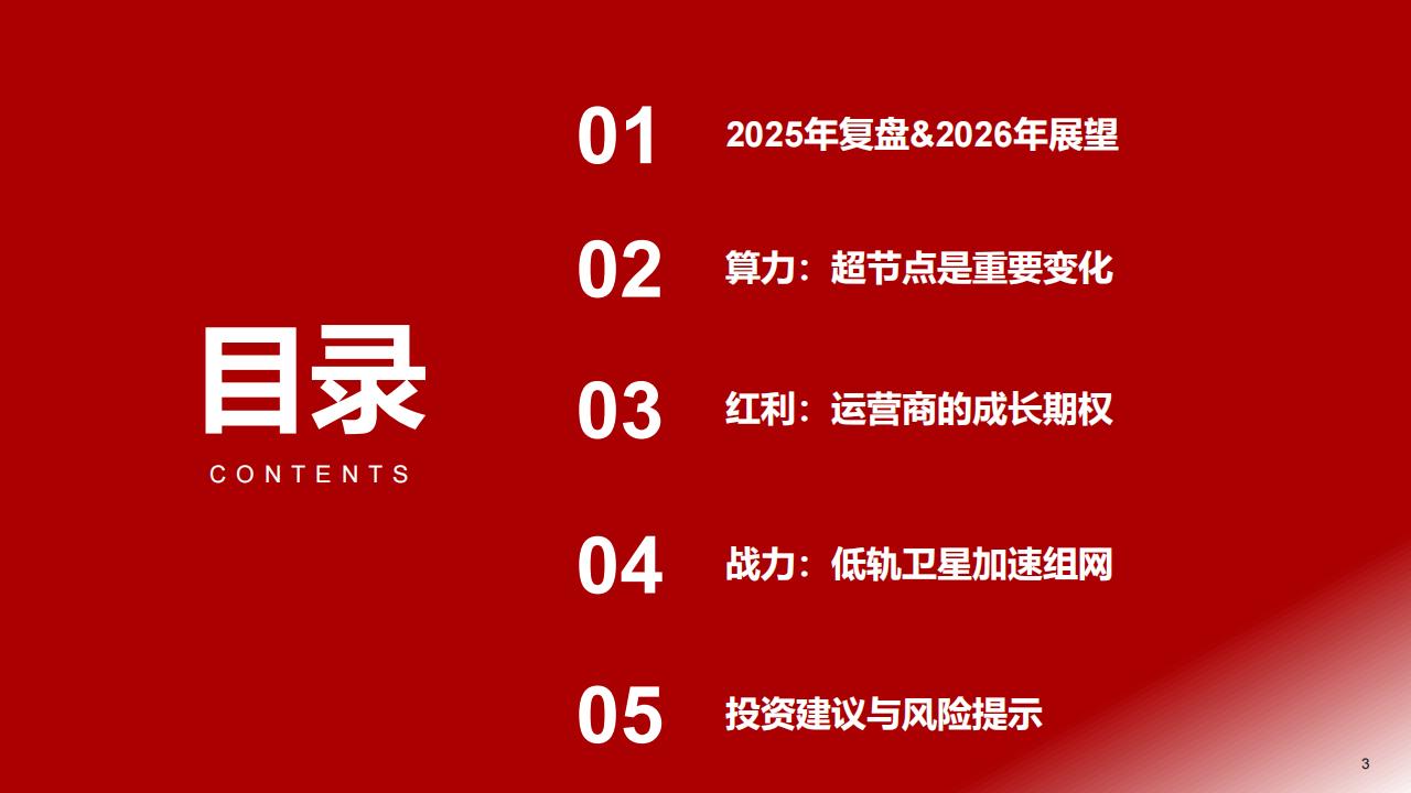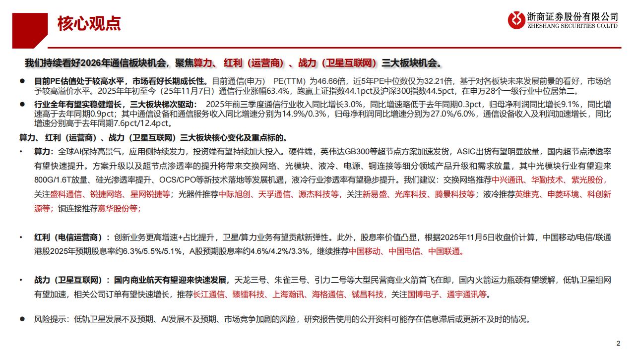 我们持续看好2026年通信板块机会,聚焦算力、红利(运营商)、战力(卫星互联网)三大板块机会。