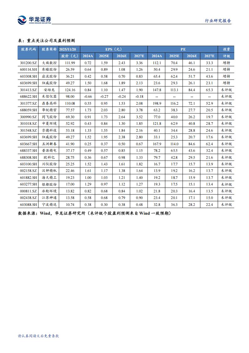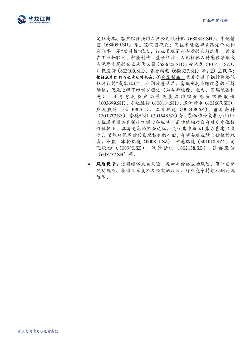 投资建议:通用设备内部具备结构性投资机会,维持行业“推荐”评级。建议关注:1)主线一:拥抱产业升级与高景气赛道。①机床工具:工业母机直接受益于制造业升级和设备更新政策。金属切削机床的高增长和日本对华机床出口的持续增长,验证了高端市场需求有所复苏,关注在新能源汽车、航空航天等领域有广泛应用的五轴联动、高精度机床制造商海天精工(601882.SH)、纽威数控(688697.SH)、大族数控(301200.SZ)、宁波精达(603088.SH)等;碳化钨价格上涨虽带来成本压力,但有利于拥有核心技术、具备成本传导能力的中高端龙头企业集中度提升。重点关注产品定位高端、客户粘性强的刀具公司欧科亿(688308.SH)、华锐精密(688059.SH)等。②仪器仪表:高技术壁垒带来高定价权和利润率,是“硬科技”代表,行业呈现量利齐增的良好态势。关注在工业物联网、智能制造、量子科技、人形机器人传感器等领域有深厚布局的企业禾信仪器(688622.SH)、安培龙(301413.SZ)、川仪股份(603100.SH)、普源精电(688337.SH)等。2)主线二:挖掘成本红利与逆境反转机会。①金属制品:显著受益于钢材价格低位运行的“成本红利”,利润改善明显。需甄别其业绩改善的可持续性。优先选择下游需求稳定(如与新能源、电力、高端装备相关),且自身具备产品升级能力的细分龙头纽威股份(603699.SH)、东睦股份(600114.SH)、五洲新春(603667.SH)、应流股份(603308.SH)、江苏神通(002438.SZ)、鼎泰高科(301377.SZ)、崇德科技(301548.SZ)等。②估值修复潜力板块:其他通用设备和制冷空调设备板块当前估值相对自身历史中位数涨幅较小,具备更高的安全边际。关注其中与AI算力基建(液冷)、节能环保等新兴需求相关的个股,有望实现业绩与估值的双击。个股:冰轮环境(000811.SZ)、申菱环境(301018.SZ)、同飞股份(300990.SZ)、汉钟精机(002158.SZ)、银都股份(603277.SH)等。
