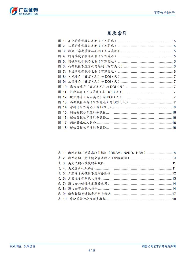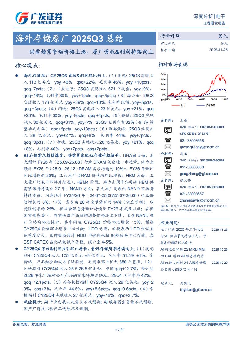 入113亿美元,yoy+46%,qoq+22%,毛利率46%,yoy +10pcts,qoq+7pcts;(2)三星电子:25Q3实现收入621亿美金,yoy+9%,qoq+16%;毛利率39%,yoy+1pcts,qoq+5pcts;(3)海力士:25Q3实现收入176亿美元,yoy+39%,qoq+10%,毛利率57%,yoy+5pcts,qoq+3pcts;(4)闪迪:25Q3实现收入23亿美元,yoy+21%,qoq+23%,毛利率30%,yoy-9pcts,qoq+4pcts;(5)铠侠:25Q3实现收入30亿美元,qoq+31%,yoy-7%,25Q3毛利率为32%(含JV调整后毛利率),qoq+5pcts,yoy-13pcts;(6)西部数据:25Q3实现收入28亿美元,yoy+27%,qoq+8%,毛利率44%,yoy+7pcts,qoq+3pcts;(7)希捷:25Q3实现收入26亿美元,yoy +21%,qoq+8%,毛利率40%,yoy+7pcts,qoq+2pcts.
