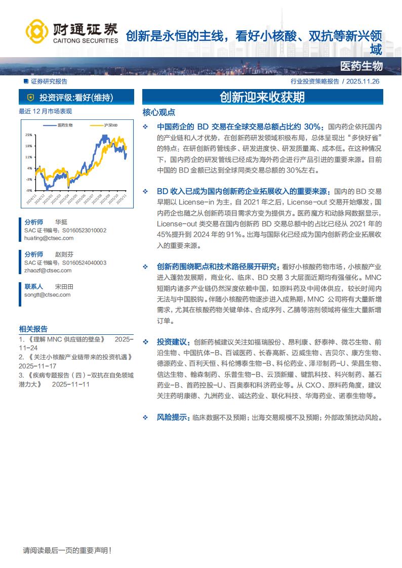 创新药围绕靶点和技术路径展开研究:看好小核酸药物市场,小核酸产业进入蓬勃发展期,商业化、临床、BD交易3大层面近期均有强催化。MNC短期内诸多产业链仍然深度依赖中国,如原料药及中间体供应,较长时间内无法与中国脱钩。伴随小核酸药物逐步进入成熟期,MNC 公司将有大量新增需求,尤其在核酸药物关键单体、合成序列、乙腈等溶剂领域将催生大量新增订单。