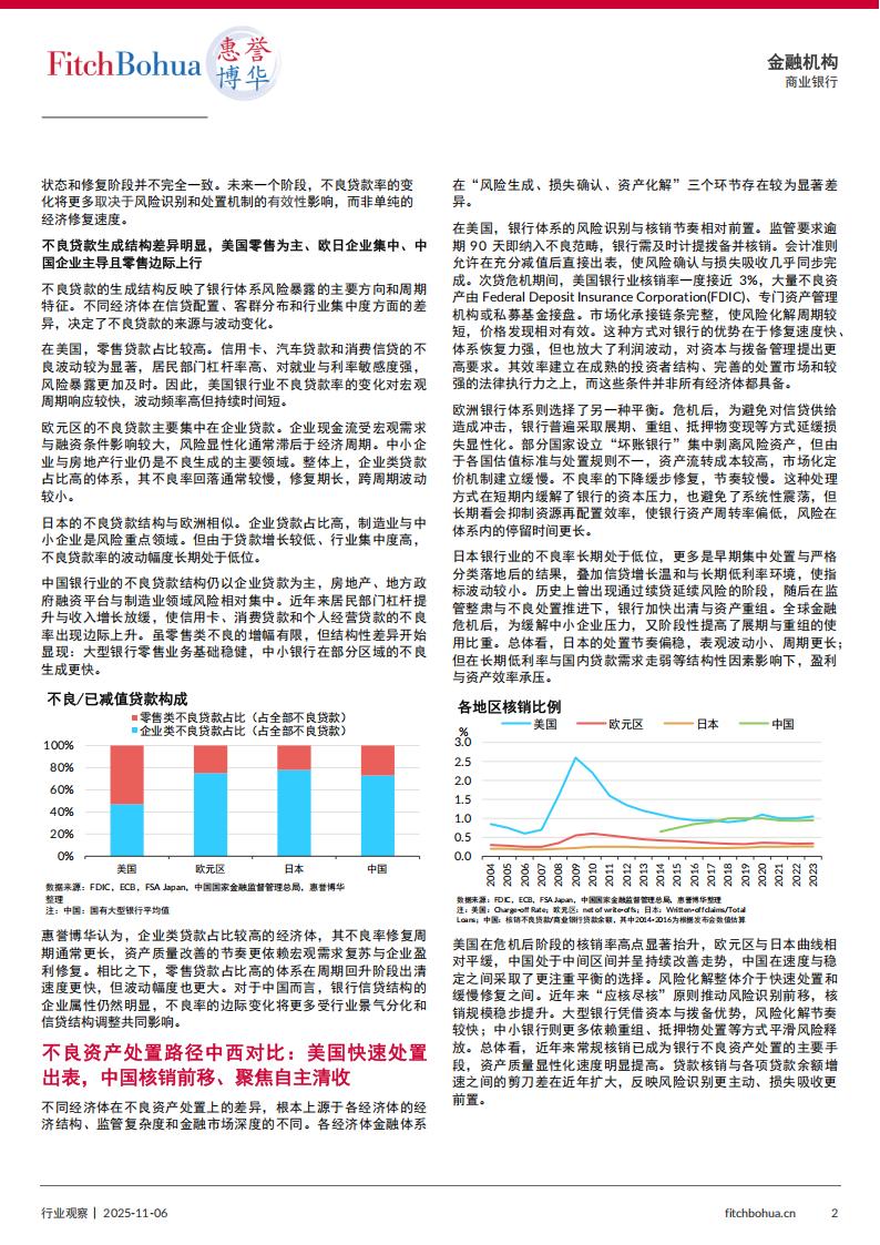 不良贷款生成结构决定资产质量弹性,美国不良贷款中零售占比较高、对就业与利率更敏感,波动较大;欧日以企业类为主,风险显性化相对滞后;中国仍以企业类为主,零售端不良呈边际抬升。