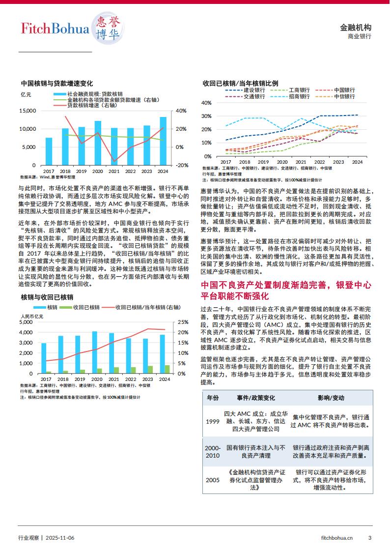 中国银行业的不良贷款结构仍以企业贷款为主,房地产、地方政府融资平台与制造业领域风险相对集中。近年来居民部门杠杆提升与收入增长放缓,使信用卡、消费贷款和个人经营贷款的不良率出现边际上升。虽零售类不良的增幅有限,但结构性差异开始显现:大型银行零售业务基础稳健,中小银行在部分区域的不良生成更快。在“风险生成、损失确认、资产化解”三个环节存在较为显著差异。