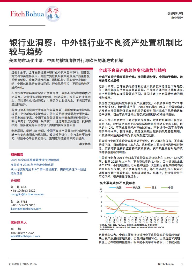 中国银行业自2014年以来不良贷款率总体稳定在1.5%-1.8%区间。截至2025年上半年,不良贷款率约1.49%,关注类贷款占比约2.17%。不同类型银行之间差异明显:大型银行受客户结构与资本充足水平支撑,资产质量保持平稳;部分中小银行受区域经济调整和房地产风险影响,指标波动略高。总体上,行业风险处于可控区间,资产质量变化温和。惠誉博华认为,全球主要经济体银行业不良贷款率的收敛趋势反映出资产质量的普遍改善,但在风险识别时点、出清速度和周期长度上仍存在结构性差异。相似的不良率水平背后,代表的风险状态和修复阶段并不完全一致。未来一个阶段,不良贷款率的变化将更多取决于风险识别和处置机制的有效性影响,而非单纯的经济修复速度。