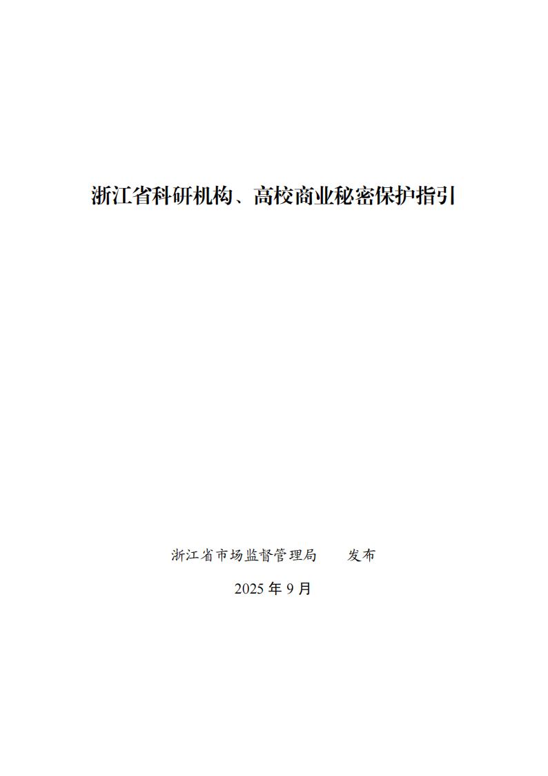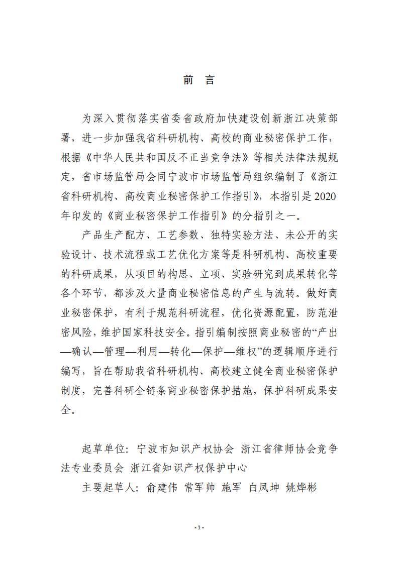 为深入贯彻落实省委省政府加快建设创新浙江决策部署,进一步加强我省科研机构、高校的商业秘密保护工作,根据《中华人民共和国反不正当竞争法》等相关法律法规规定,省市场监管局会同宁波市市场监管局组织编制了《浙江省科研机构、高校商业秘密保护工作指引》,本指引是2020年印发的《商业秘密保护工作指引》的分指引之一。