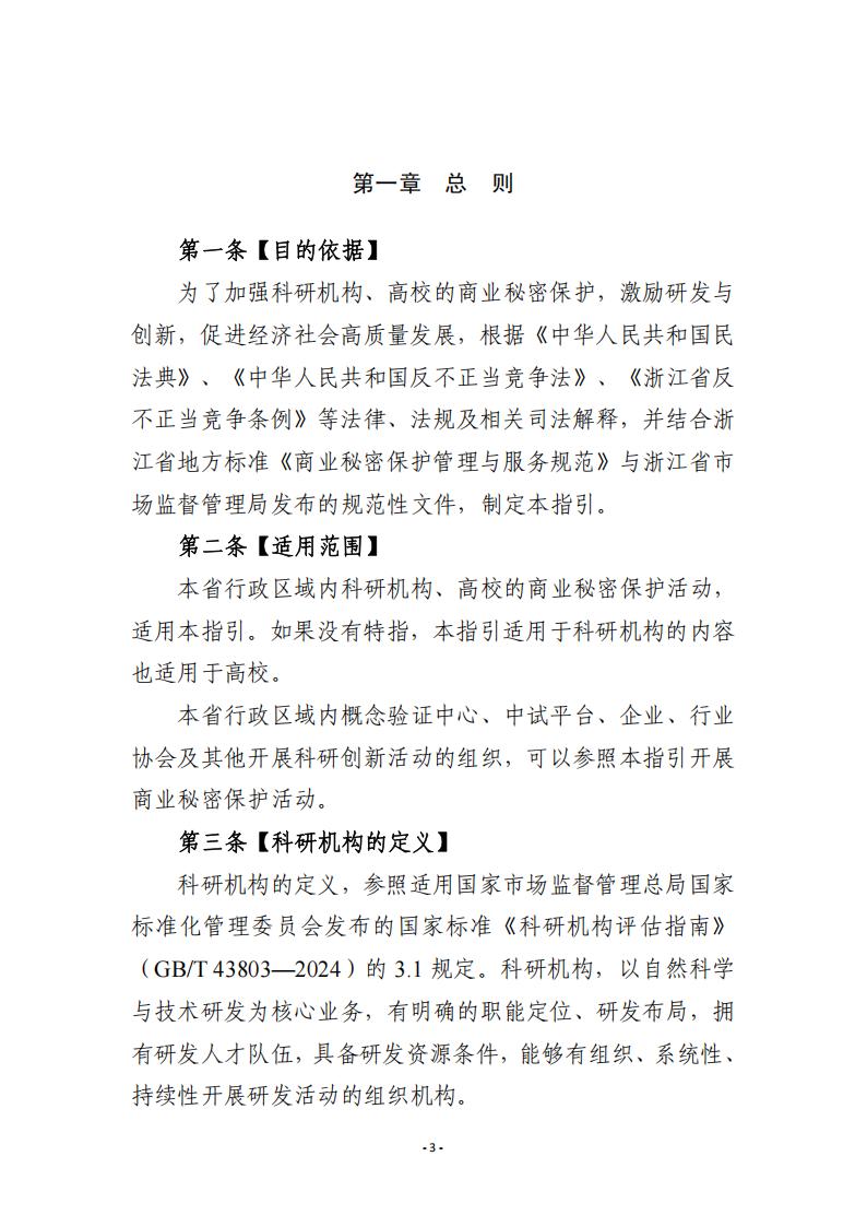 为了加强科研机构、高校的商业秘密保护,激励研发与创新,促进经济社会高质量发展,根据《中华人民共和国民法典》、《中华人民共和国反不正当竞争法》、《浙江省反不正当竞争条例》等法律、法规及相关司法解释,并结合浙江省地方标准《商业秘密保护管理与服务规范》与浙江省市场监督管理局发布的规范性文件,制定本指引。