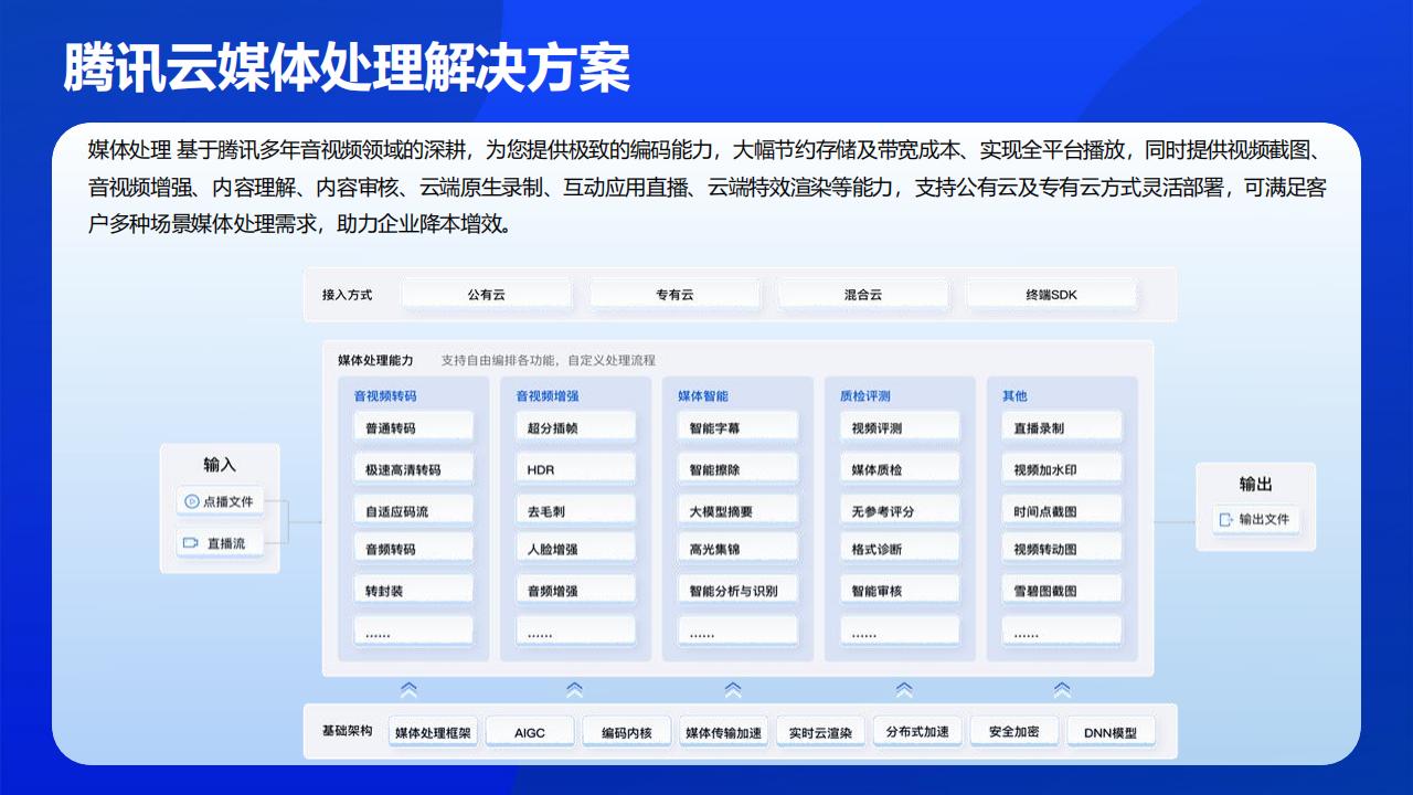 媒体处理基于腾讯多年音视频领域的深耕,为您提供极致的编码能力,大幅节约存储及带宽成本、实现全平台播放,同时提供视频截图音视频增强、内容理解、内容审核、云端原生录制、互动应用直播、云端特效宣染等能力,支持公有云及专有云方式灵活部署,可满足客户多种场景媒体处理需求,助力企业降本增效。媒体处理基于腾讯多年音视频领域的深耕,为您提供极致的编码能力,大幅节约存储及带宽成本、实现全平台播放,同时提供视频截图音视频增强、内容理解、内容审核、云端原生录制、互动应用直播、云端特效宣染等能力,支持公有云及专有云方式灵活部署,可满足客户多种场景媒体处理需求,助力企业降本增效。智能字幕(埃及、翻译、配音)、视频拆条、精彩集锦、横转竖、智能摘要等其他媒体A处理能力,依托大模型实现多场景视频智