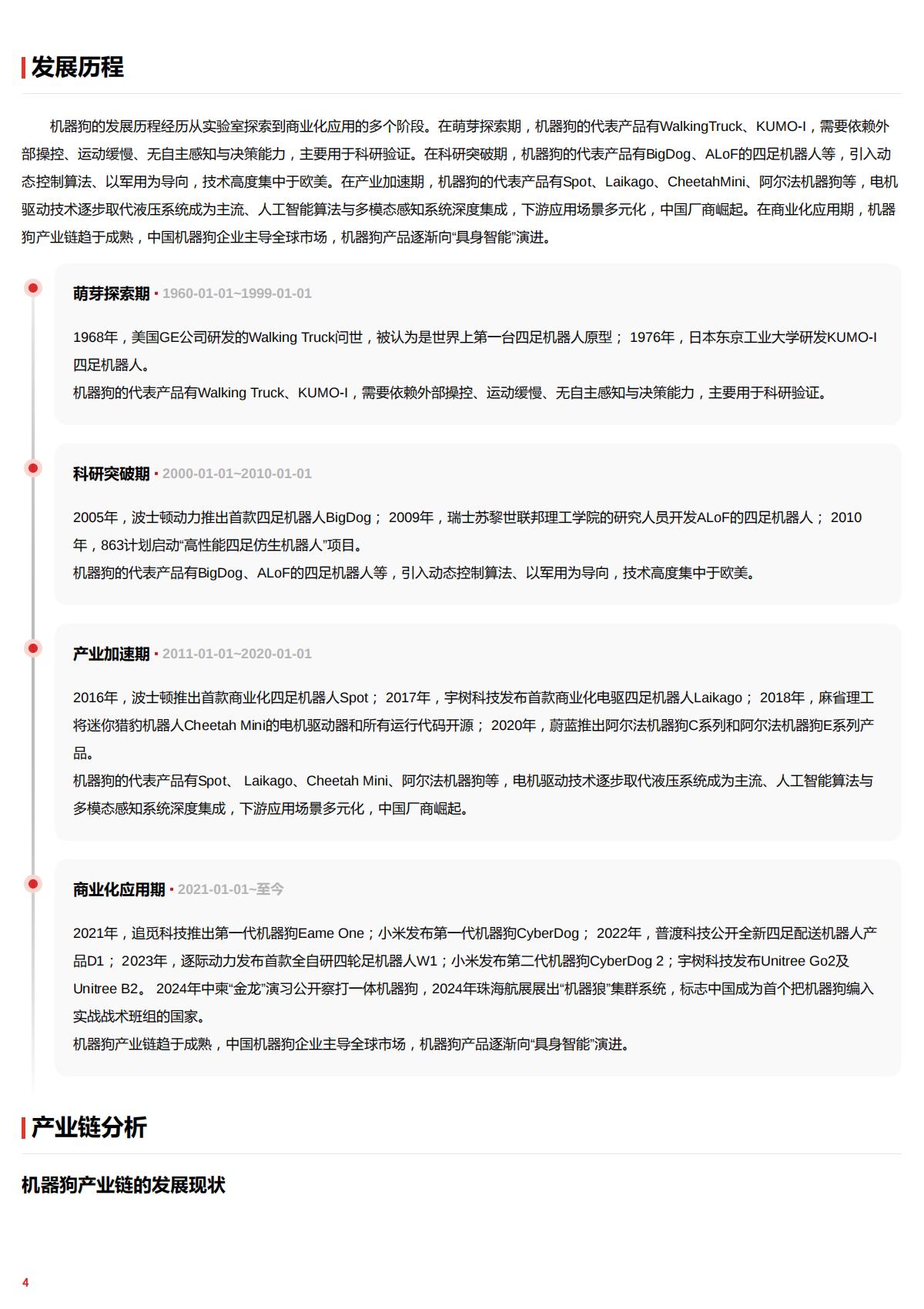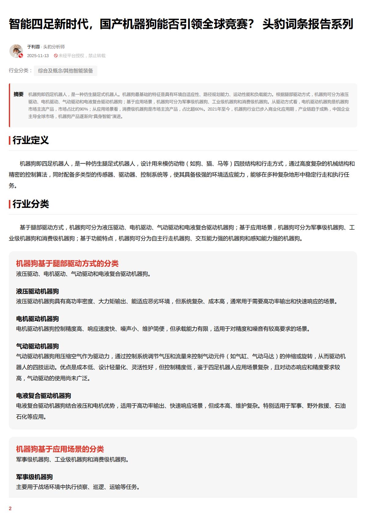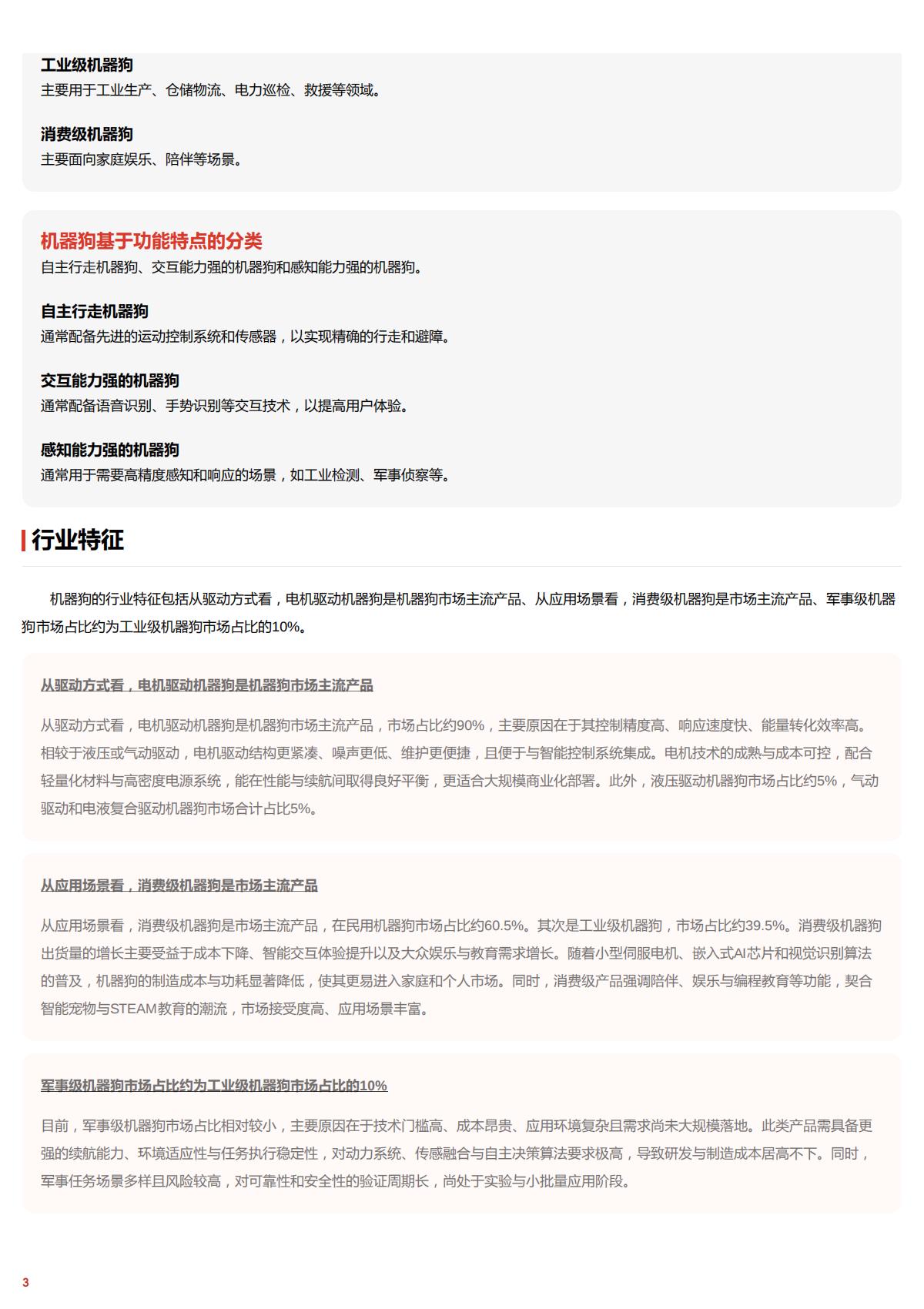 摘要机器的犯D四足机器人,是一种仿生麟足式机器人,机器品基础的特征是具有环境自适应性、跑程规划能力、运动性能和负顺能力,根矩疆邮姬动方式,机器豹可分为液压陋动、电机驱动、气助陋助和电液复合距动机器狗;墨于应用场量,机器狗可分为军事级机器、工业级机器和消费级机器犯,从陋动方式看,电机距动机器物是机器狗市场主泊产品,市场占比均5C%;从应用场里看,消费级机器物是市场主泊产品,占比题EC%,2Z021年至今,机器狗行业已步入商业化应用期,产业错趋于成熟,中国企业主导全球市场,机器狗产品逐渐向“具身智能“演进。