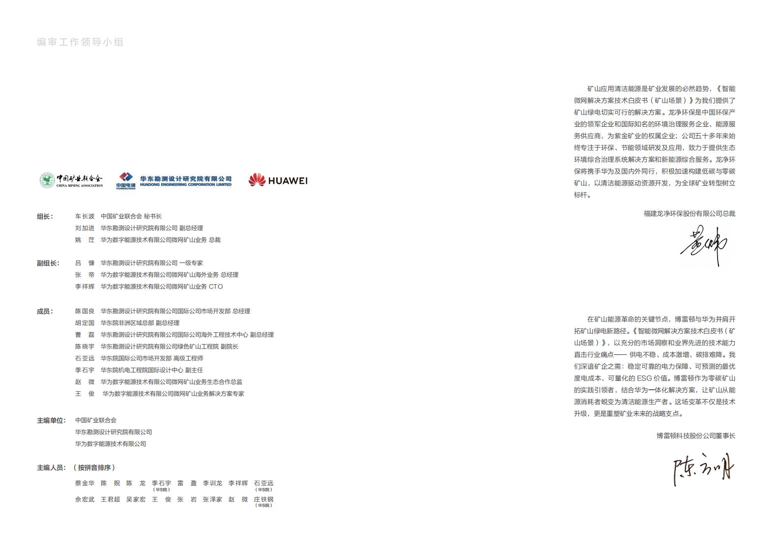 矿山应用清洁能源是矿业发展的必然趋势。《智能微网解决方案技术白皮书(矿山场景)》为我们提供了矿山绿电切实可行的解决方案。龙净环保是中国环保产业的领军企业和国际知名的环境治理服务企业、能源服务供应商,为紫金矿业的权属企业;公司五十多年来始终专注于环保,节能领域研发及应用。致力于提供生态环境综合治理系统解决方案和新能源综合服务。龙净环保将携手华为及国内外同行,积极加速构建低碳与零碳矿山。以清洁能源驱动资源开发。为全球矿业转型树立