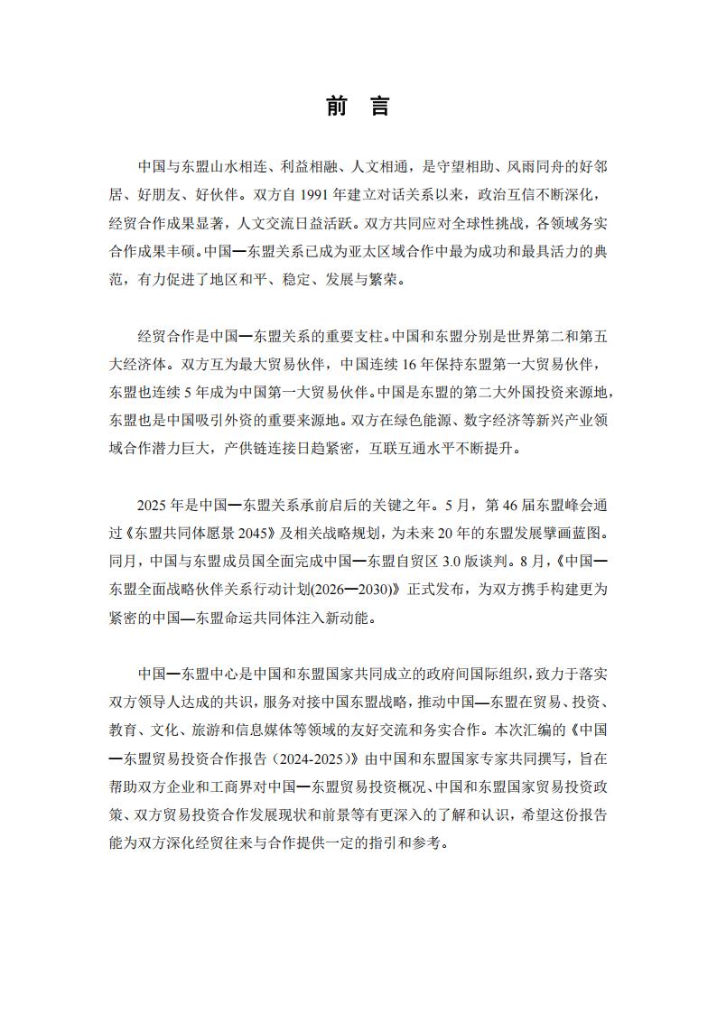 中国一东盟中心是中国和东盟国家共同成立的政府间国际组织,致力于落实双方领导人达成的共识,服务对接中国东盟战略,推动中国—东盟在贸易、投资、教育、文化、旅游和信息媒体等领域的友好交流和务实合作。本次汇编的《中国一东盟贸易投资合作报告(2024-2025)》由中国和东盟国家专家共同撰写,旨在帮助双方企业和工商界对中国一东盟贸易投资概况、中国和东盟国家贸易投资政策、双方贸易投资合作发展现状和前景等有更深入的了解和认识,希望这份报告能为双方深化经贸往来与合作提供一定的指引和参考。感谢各界朋友一直以来对中国一东盟中心工作的关心和支持,我们愿继续发