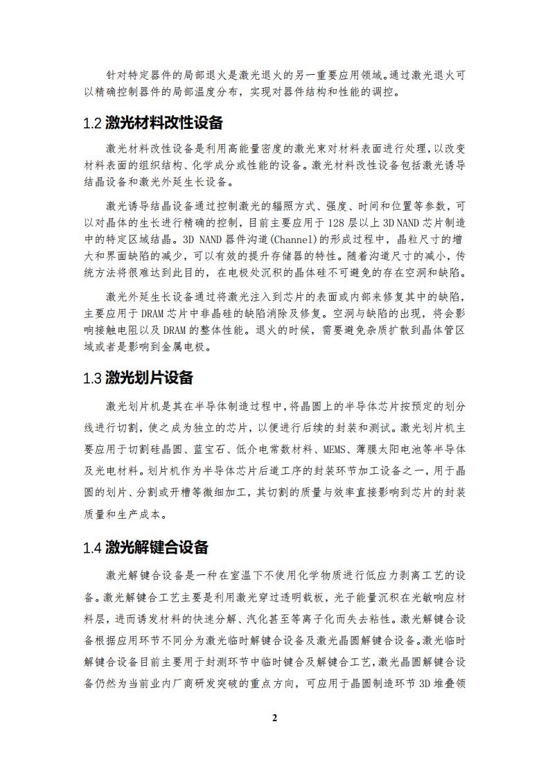 目前根据应用原理和应用工艺环节的不同,可将半导体激光设备分为应用于前道制程的激光退火设备、激光材料改性设备和应用于硅片和后道制程的激光打标设备、激光划片设备、解键合设备和修边(Trimming)设备等。