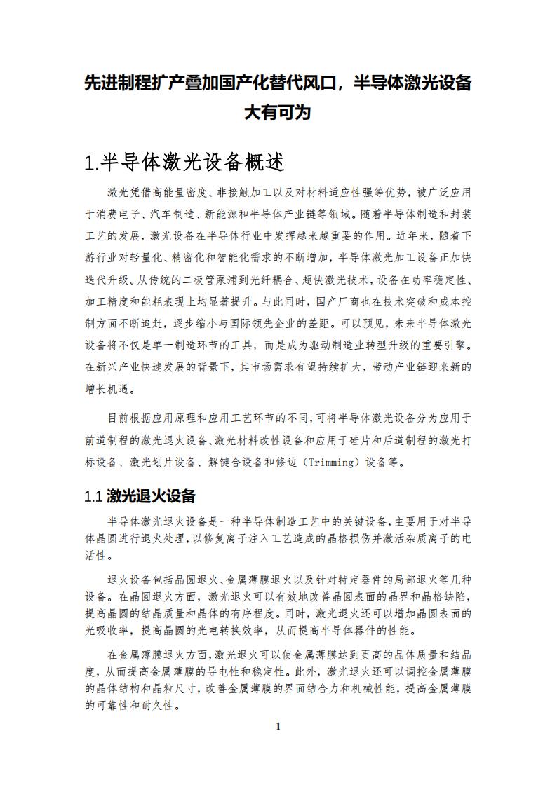 激光凭借高能量密度、非接触加工以及对材料适应性强等优势,被广泛应用于消费电子、汽车制造、新能源和半导体产业链等领域。随着半导体制造和封装工艺的发展,激光设备在半导体行业中发挥越来越重要的作用。近年来,随着下游行业对轻量化、精密化和智能化需求的不断增加,半导体激光加工设备正加快迭代升级。从传统的二极管泵浦到光纤耦合、超快激光技术,设备在功率稳定性、加工精度和能耗表现上均显著提升。与此同时,国产厂商也在技术突破和成本控制方面不断追赶,逐步缩小与国际领先企业的差距。可以预见,未来半导体激光设备将不仅是单一制造环节的工具,而是成为驱动制造业转型升级的重要引擎。在新兴产业快速发展的背景下,其市场需求有望持续扩大,带动产业链迎来新的增长机遇。
