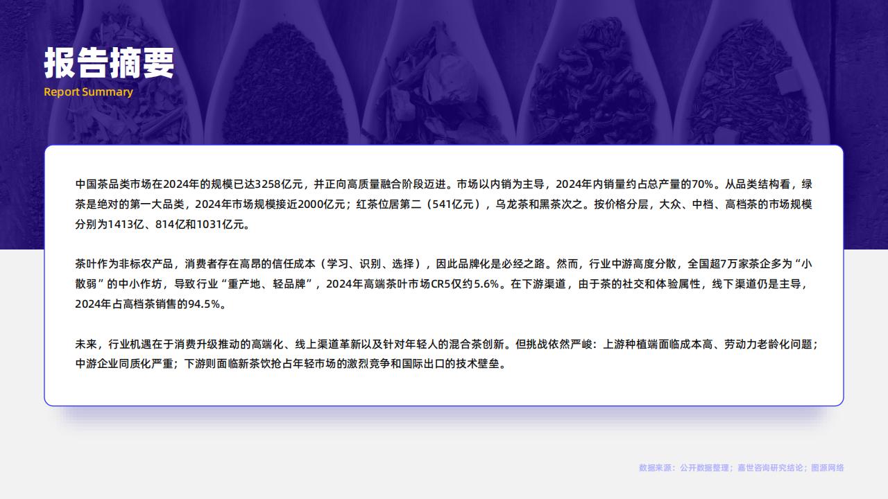 未来,行业机遇由于消费升级推动的高端化、线上线下变革以及对年轻人的混合茶创新。但挑战依然严峻:上游种植端面临成本高、劳动力老龄化问题中游企业质困化严重;下游则面临新茶饮抢占年轻市场的激烈竞争和国际口的技术隐患。