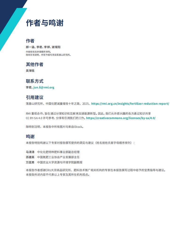 本报告是RMI“化肥行业低碳发展系列研究报告”的首份研究成果,旨在系统回顾和梳理全球化肥行业的发展历程和现状,并对中国十年来实施化肥减量增效的政策、行动和成效进行总结。在此基础上,本报告聚焦全球应对气候变化和能源转型背景,对未来化肥行业进一步转型发展的机遇与挑战做出总体展望。我们也将在后续的研究中就化肥行业的低碳转型之路继续提出不同侧重的具体思路与建议。转型与改革仍在继续,新时代为其注入了新的内涵。过去十年只是一个开端,“温故而知新”,总结经验旨在更好地前行,为中国农业与工业下一步的转型夯实基础。同时,“他山之石,可以攻玉”。本报告也希望帮助国际社会理解中国农业绿色发展的路径和逻辑,为其他发展中国家提供借鉴,共同促进全球农食系统向更可持续、更公平、更具韧性的方向迈进。