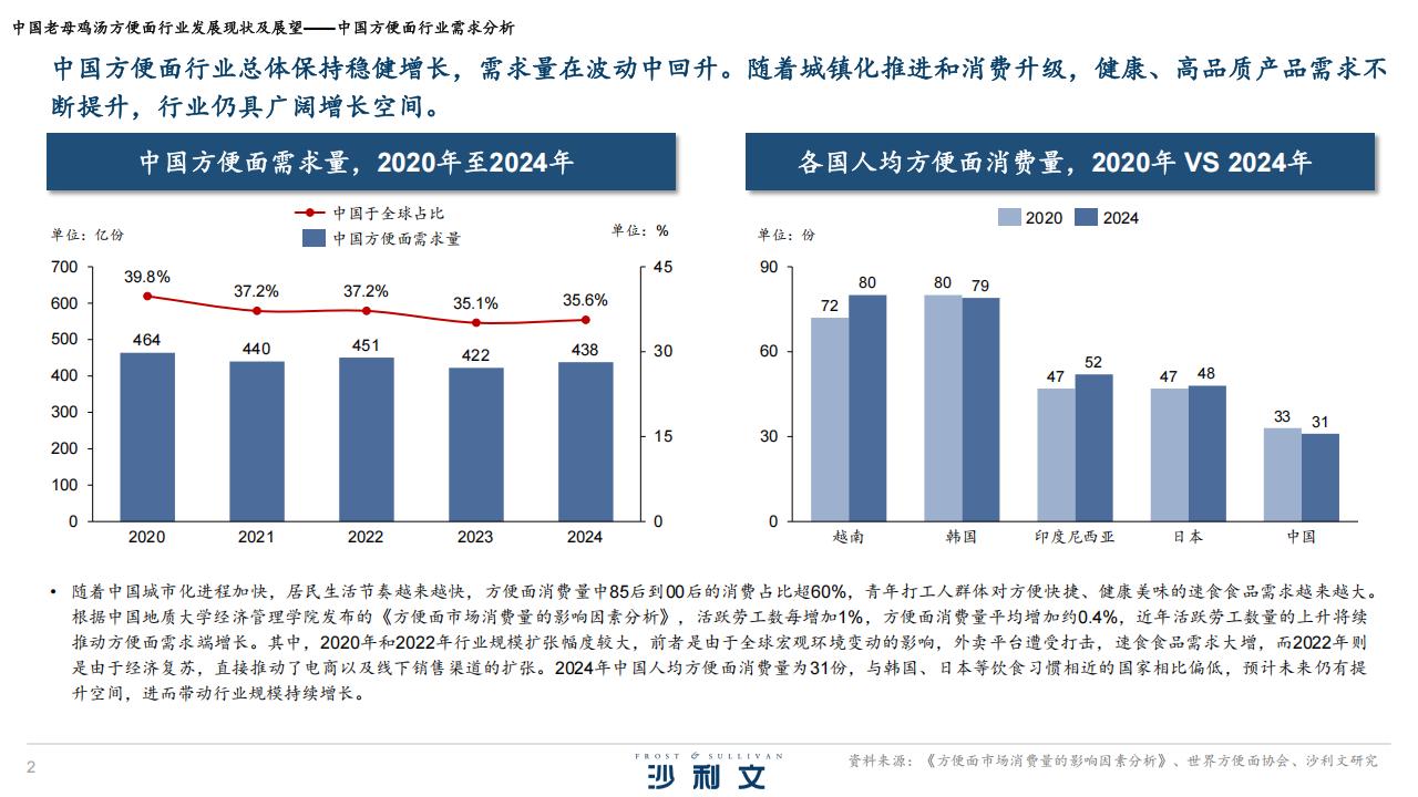 随着中国城市化进程加快,居民生活节奏越来越快,方便面消费量由85后到80后的消费占比超60%。青年打工人群体对方便快捷、健康美味的速食食品需求越来越大。根据中国地质大学经济管理学院发布的《方便面市场消费的影响因素分析》,活跃工人数每增加1%,方便面消费水平均增加约0.4%,近年活跃劳动者数量的上升持续推动方便面需求端增长。其中,2020年和2022年行业规模扩张幅度较大,前者是由于全球宏观环境变动的影响,外卖平台遭受打击,速食食品需求大增,而2022年则是由于经济复苏,直接推动了电商以及线下销售渠道的扩张。2024年中国人均方便面消费量为31份,与韩国、日本等餐饮习惯相近的国家相比偏低,预计未来仍有提升空间,进而带动行业规模持续增长。
