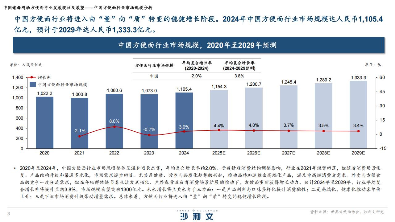 2020年至2024年,中国方便面行业市场规模整体呈温和增长态势,年均复合增长率约2.0%。受疫情后消费结构调整影响,行业在2021年短暂回落,但随着消费场景恢复、产品结构升级和渗透多元化,市场需求逐步回暖。尤其是健康、营养与品质化趋势的兴起,推动品牌加入高端化产品,满足中高端消费者需求。外包方与方便食品的竞争力度分流需求,但在年轻群体快节奏生活方式强化、户外露营及夜宵消费场景开展的推动下,方便面重新赢得增长动力。预计2024年至2029年,行业年均复品的竞争一度分流需求,但在年轻群体快节奏生活方式强化、户外露营及夜宵消费场景扩展的推动下,方便面重新获得增长动力。预计2024年至2029年,行业年均复合增长率将提升至约3.8%,市场規模有望突破1300亿元。未来增长将主要来自于三方面:一是产品创新与口味多样化提升消费黏性;二是高端化、健康化推动客单价上升:三是下沉市场消费升级带动增量需求。总体来看,方便面行业将进入由“量”向“质”转变的稳健增长阶段。从消费升级角度来看,方便面行业的整体平均售价近年不断攀升。以城市居民为代表的消费者,价格敏感度降低,愿意为更好的产品支付更高价格,消费者的需求由“吃饱”向“吃好”发生转变。在此转变下,方便面企业通过工艺苹新推动方便面高端化与品质化。在方便面市场整体升级的大背景下,高端方便面的增长势头更盛,在整体市场中的比重不断攀升。